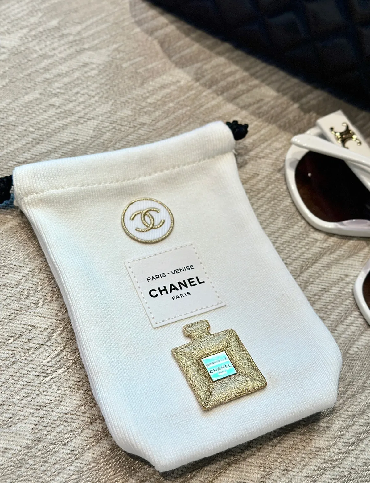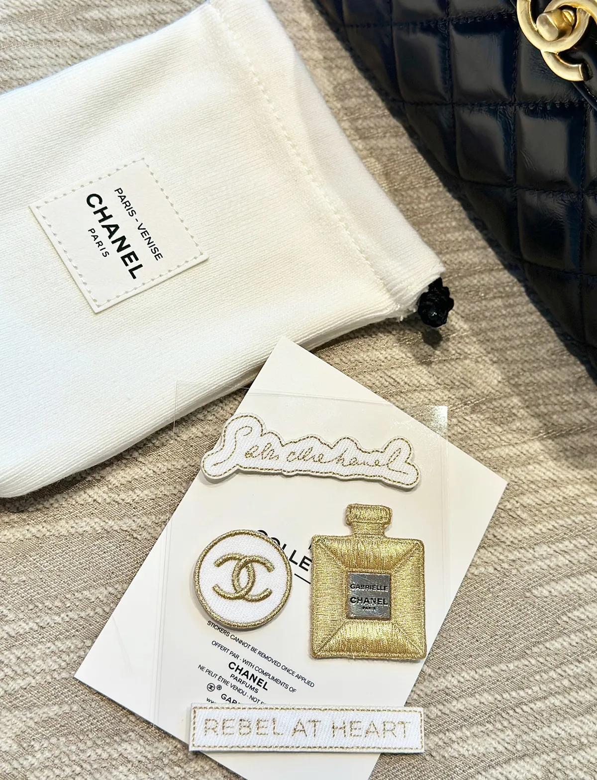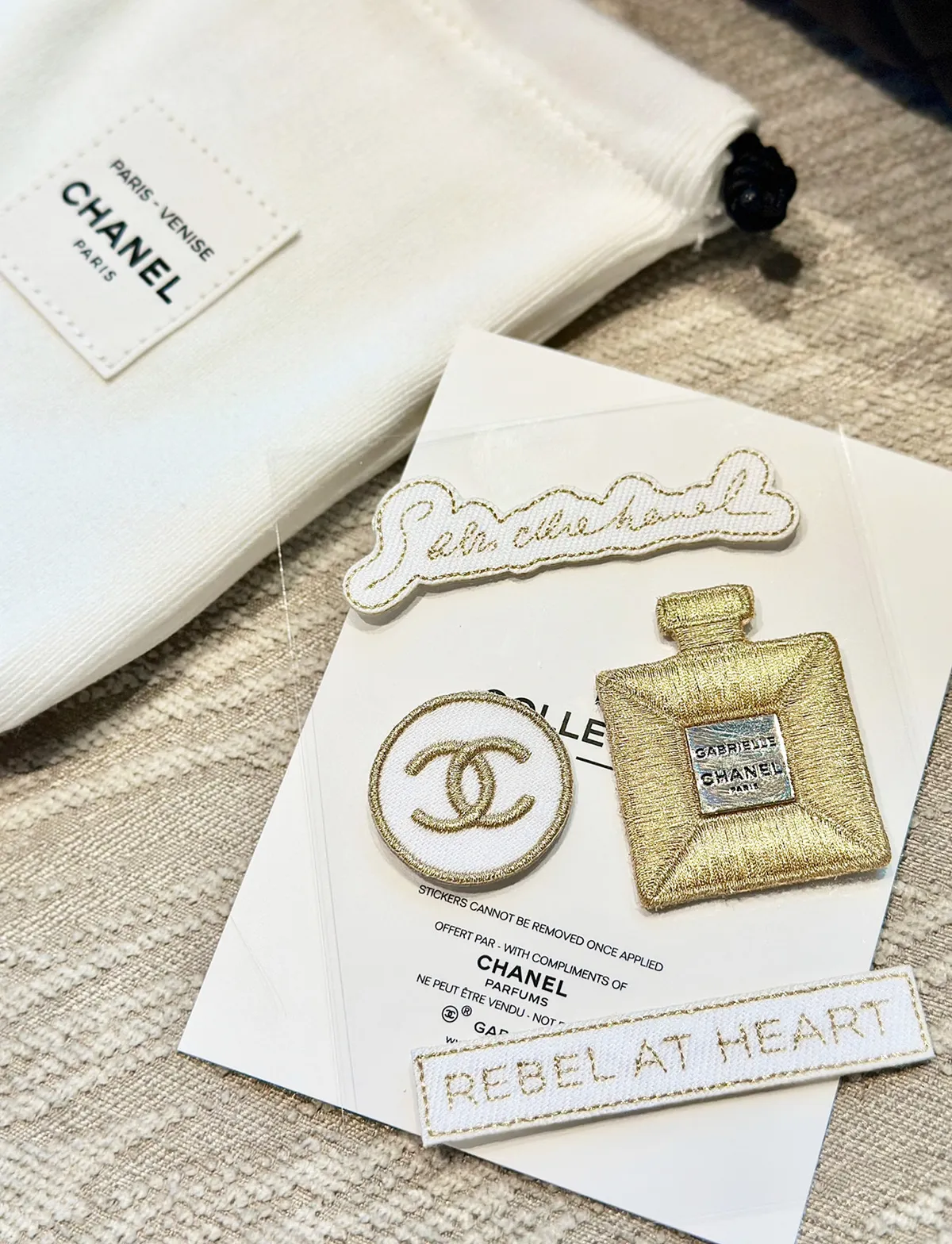 寶貴稀少數量因為是要在CHANEL彩妝櫃 尊榮VVIP 才有的!外面買不到!聖誕限量發行的!CHANEL 刺繡貼紙 它是有厚度的 貼起來都有立體感質感做工細節都很重工重點想貼哪都可以~衣服~包包~都可以~DIY超實用收納袋實品超美收到可以拿去當化妝包/墨鏡/手機都好實用這個可以拿去當聖誕禮物 超質感自用~送人都很可以收到就是一整組聖誕限定 CHANEL 收納袋+ CHANEL立體刺繡LOGO 貼紙 【尺寸】長11/底寬3/高15cm【材質】 收納袋帆布