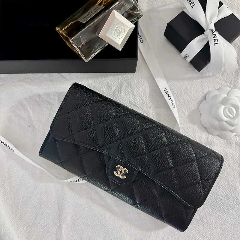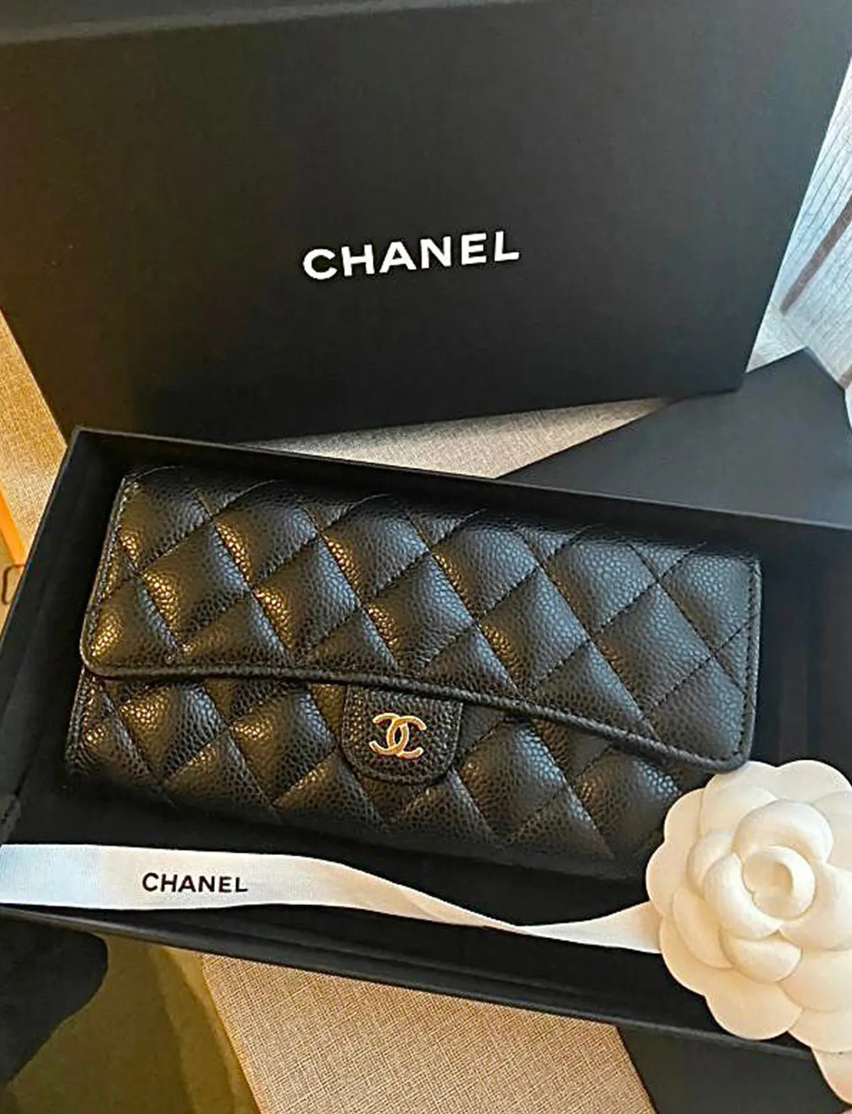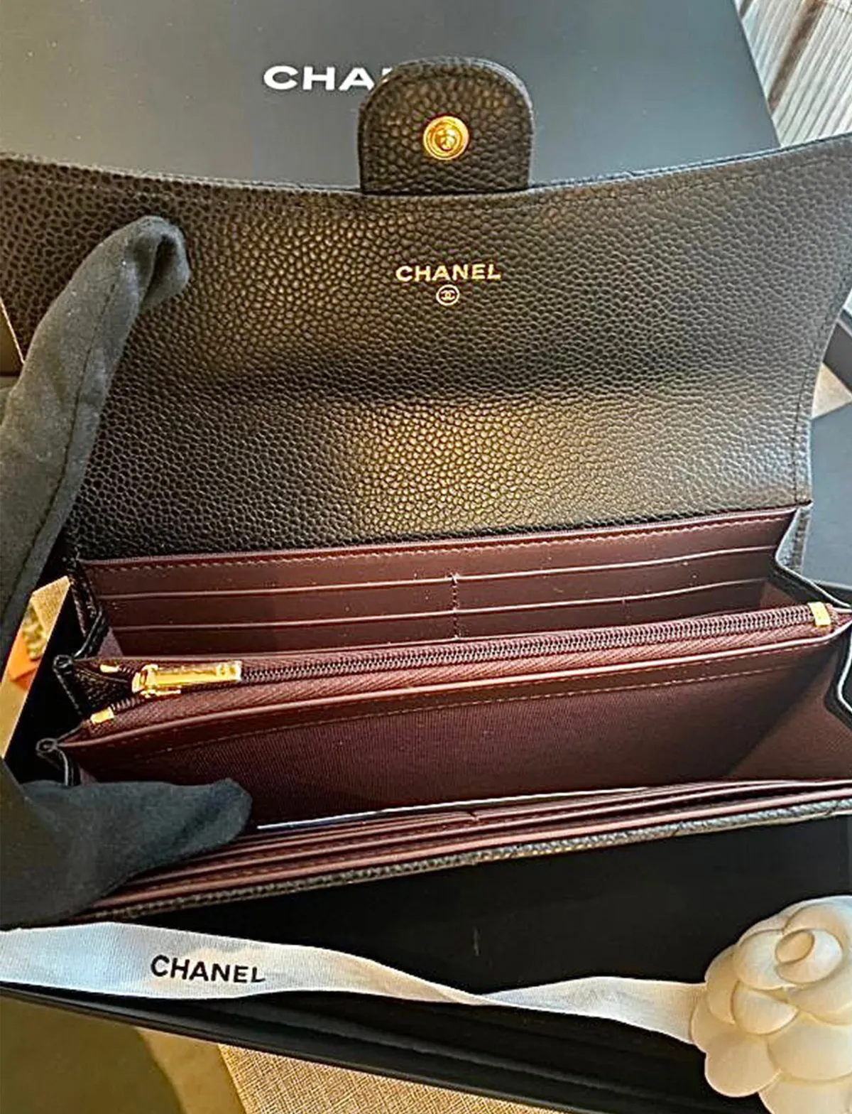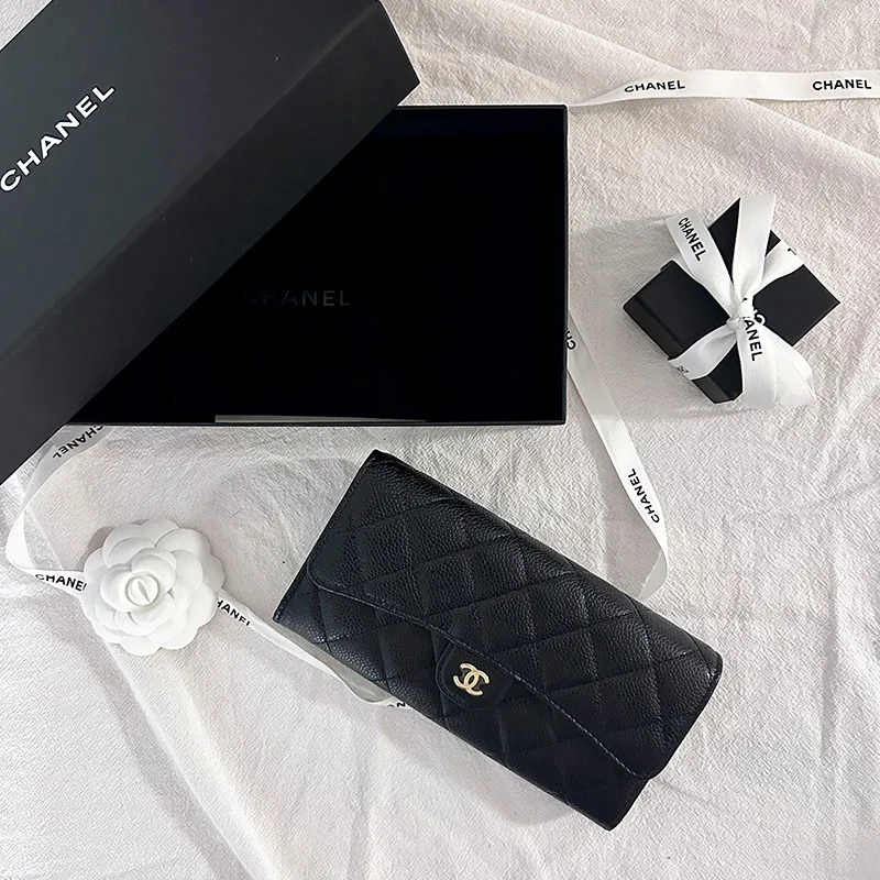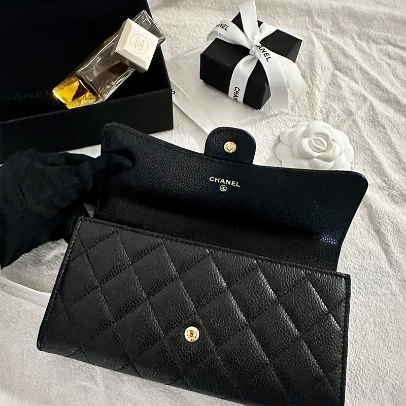 現貨-CHANEL CF 荔枝牛皮翻蓋金釦長夾(黑金緞帶聖誕包裝)