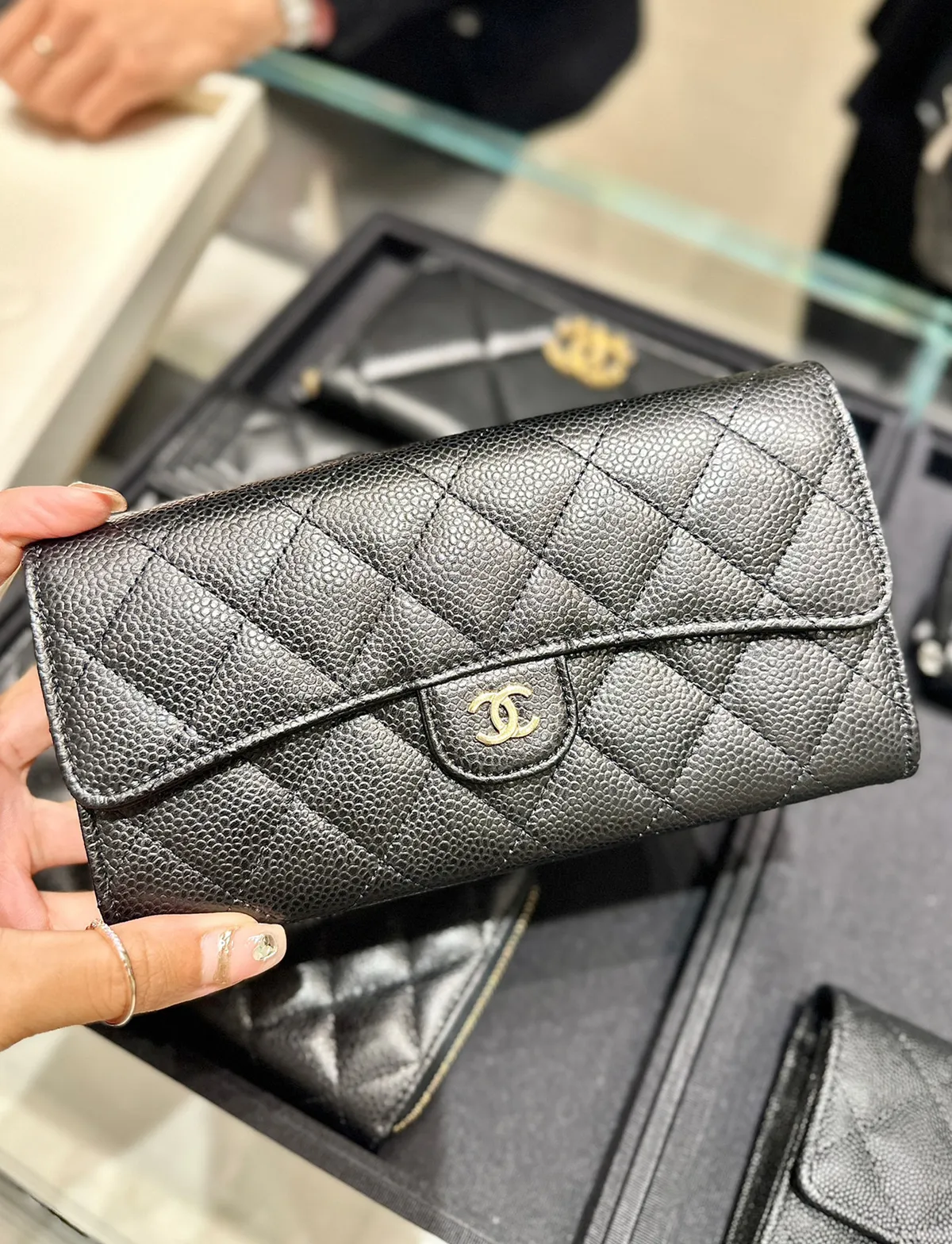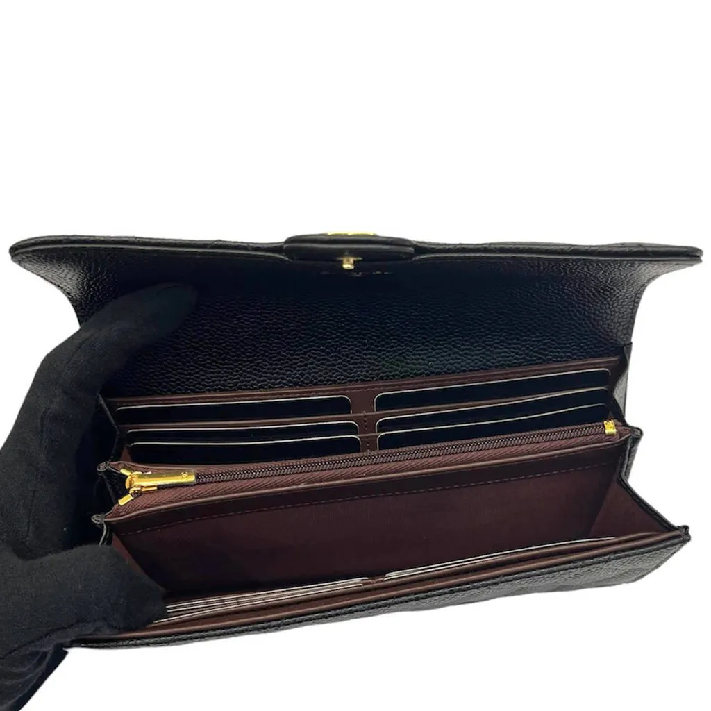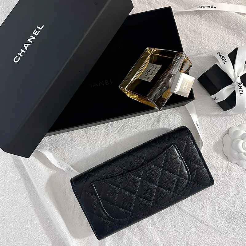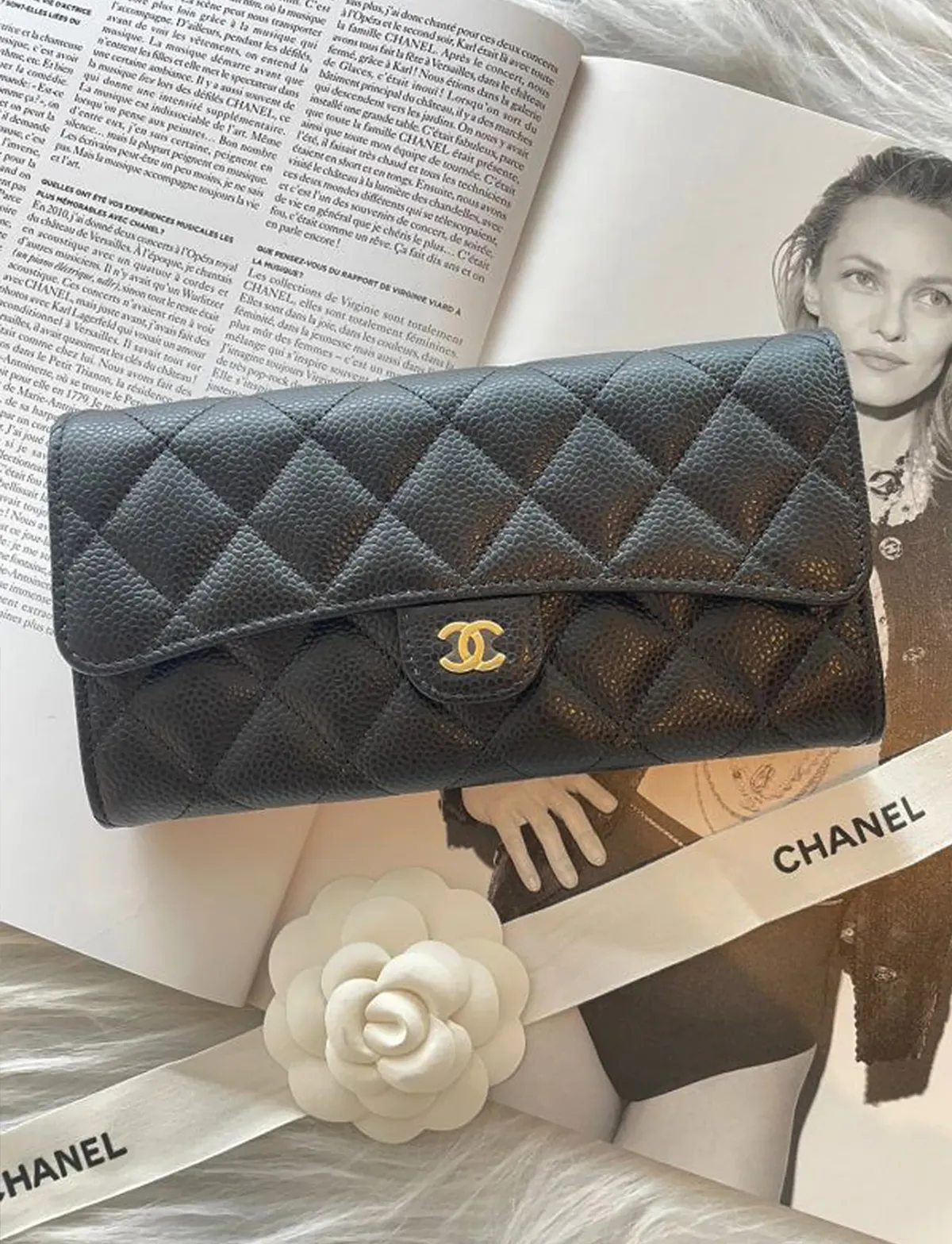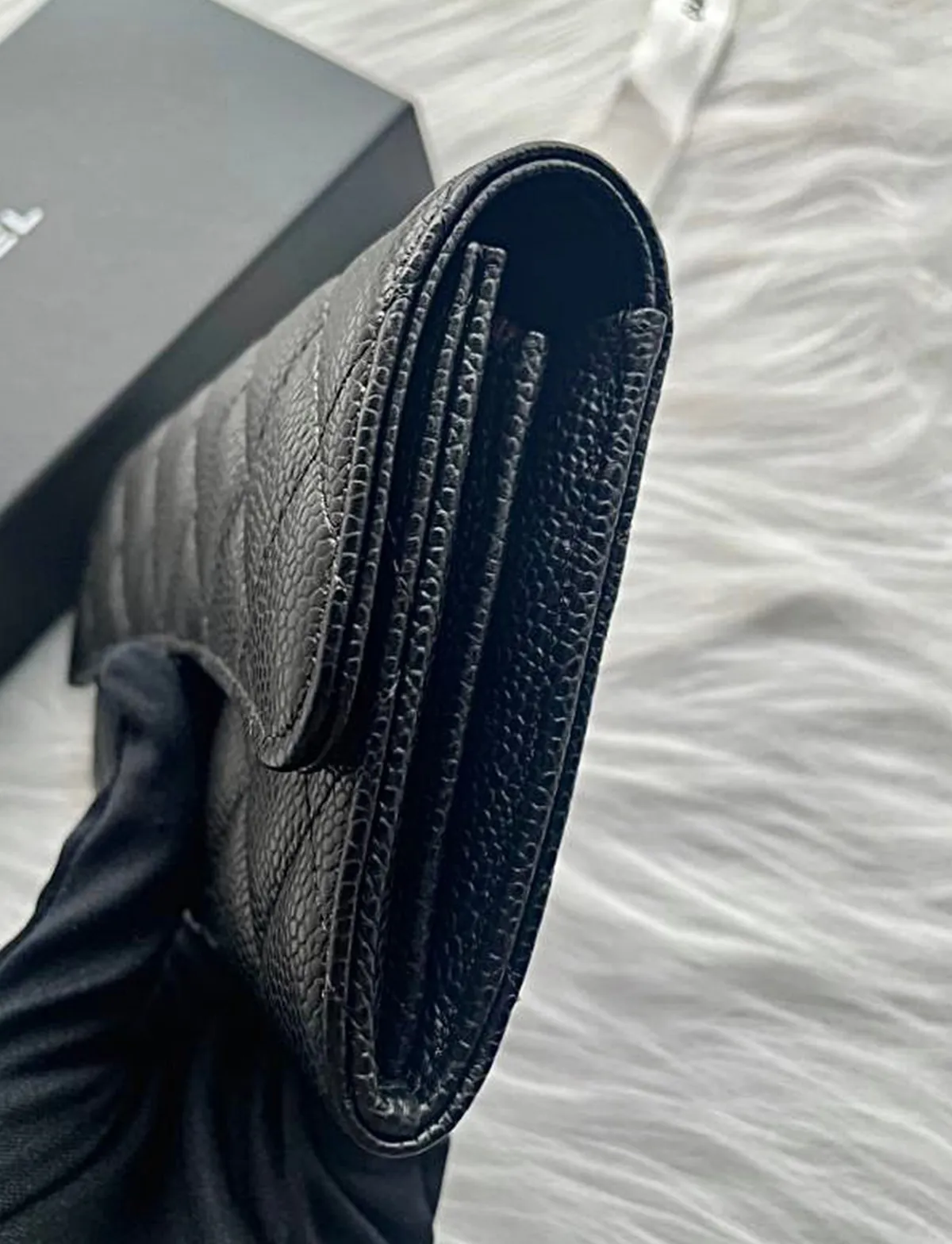 現貨-CHANEL CF 荔枝牛皮翻蓋金釦長夾(黑金緞帶聖誕包裝)