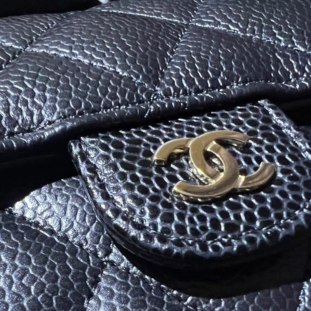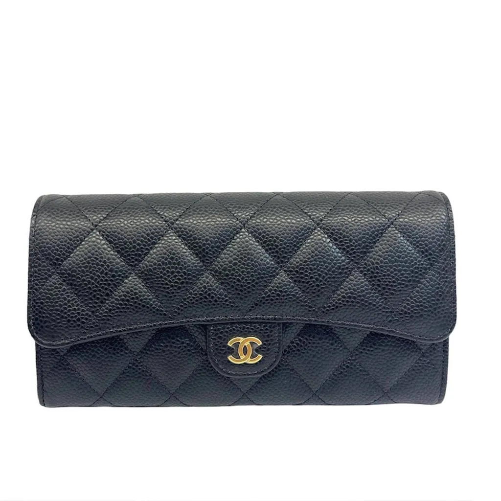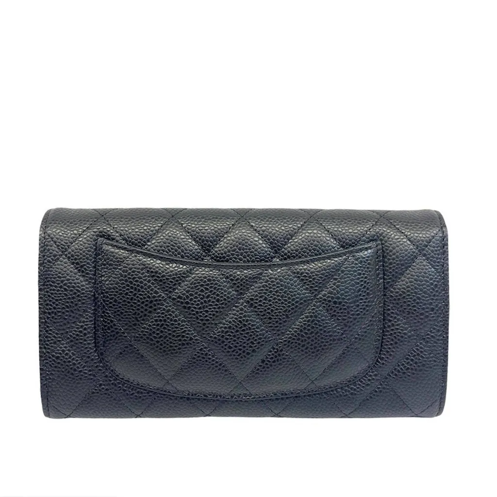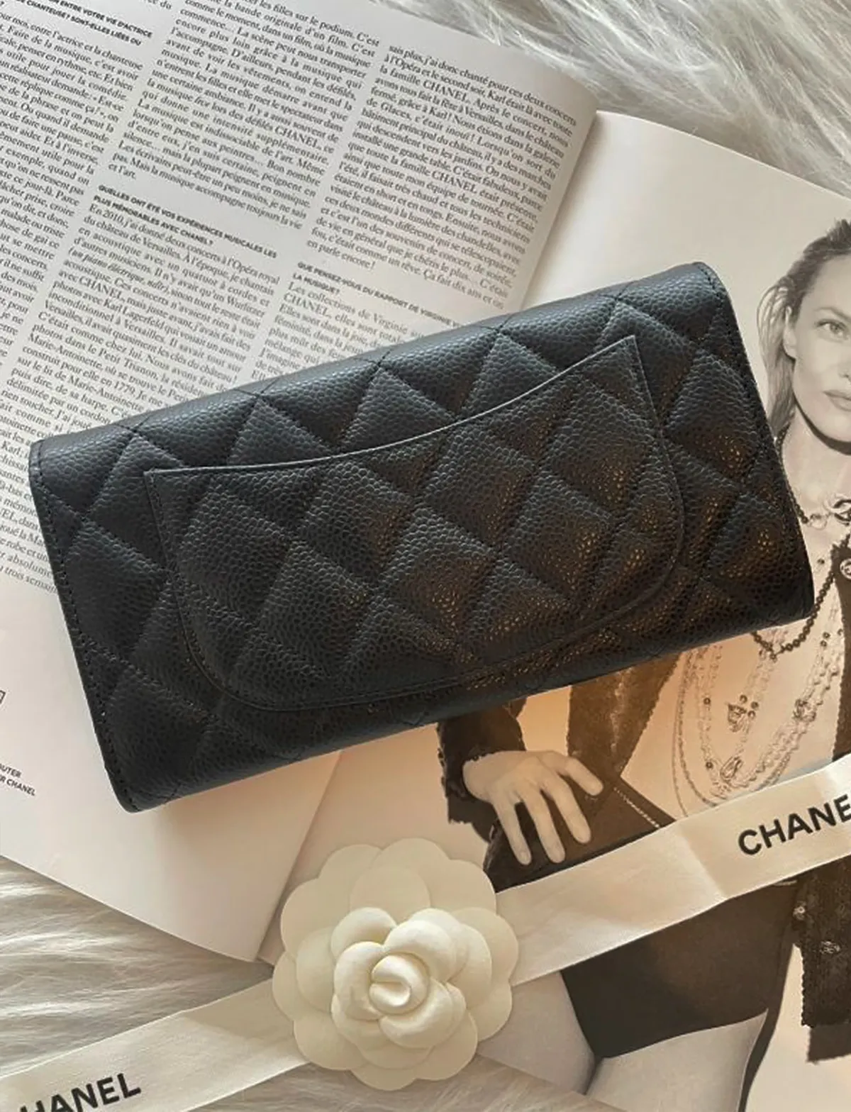 現貨-CHANEL CF 荔枝牛皮翻蓋金釦長夾(黑金緞帶聖誕包裝)