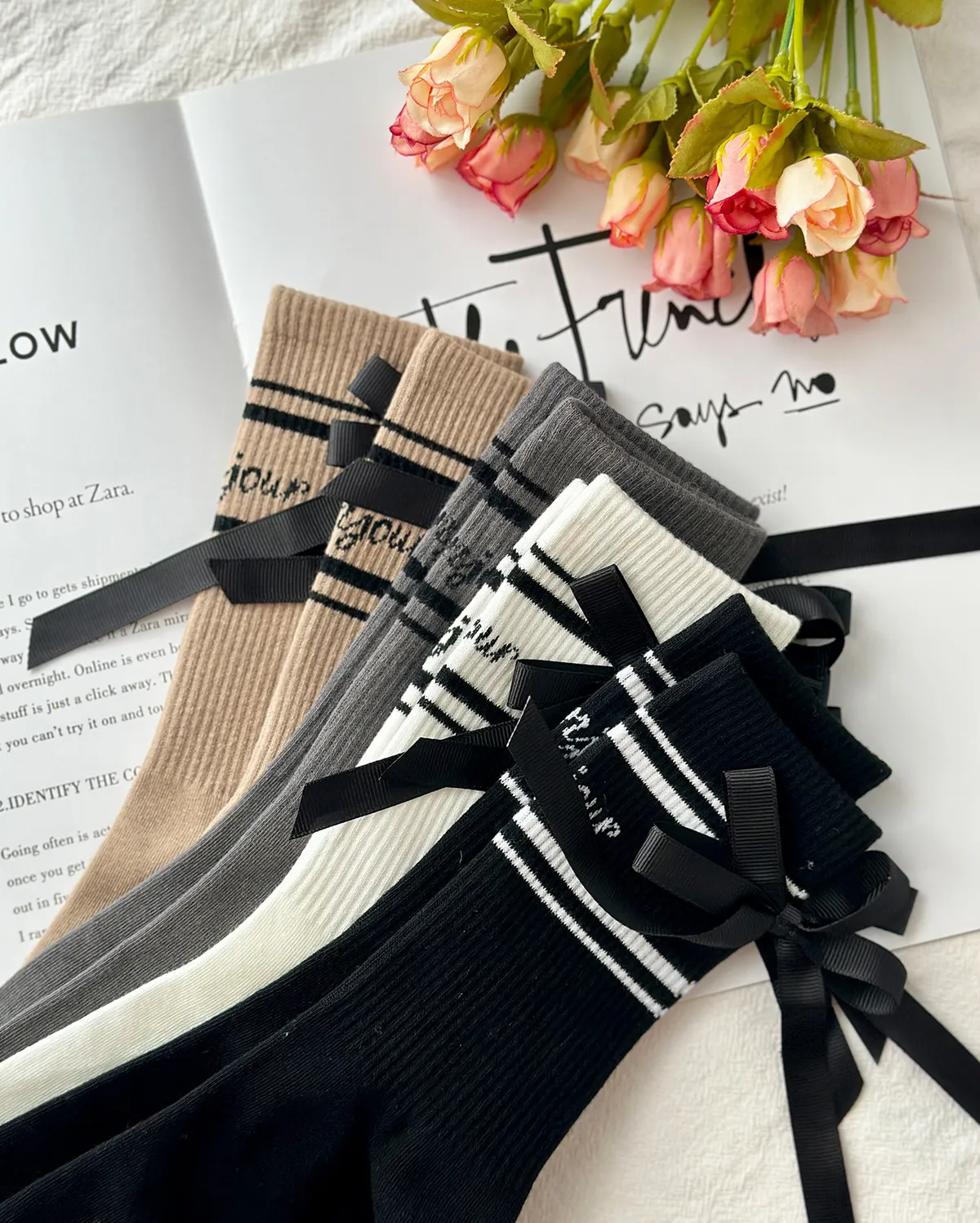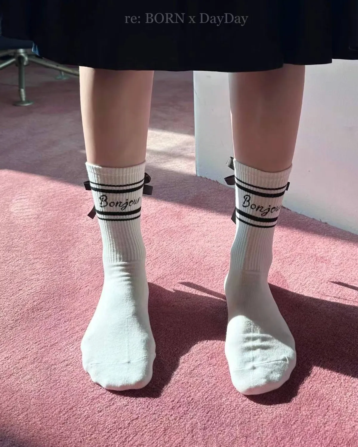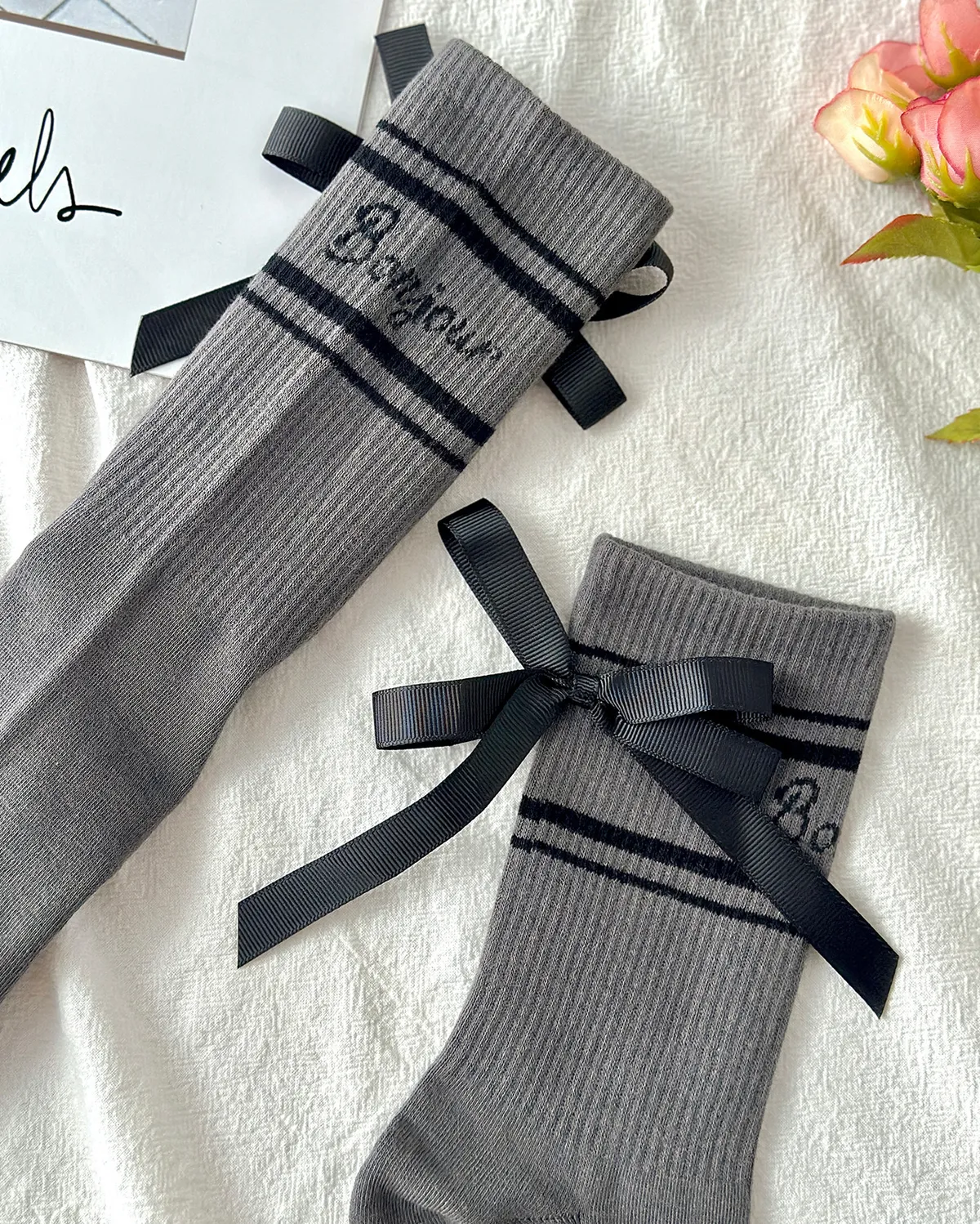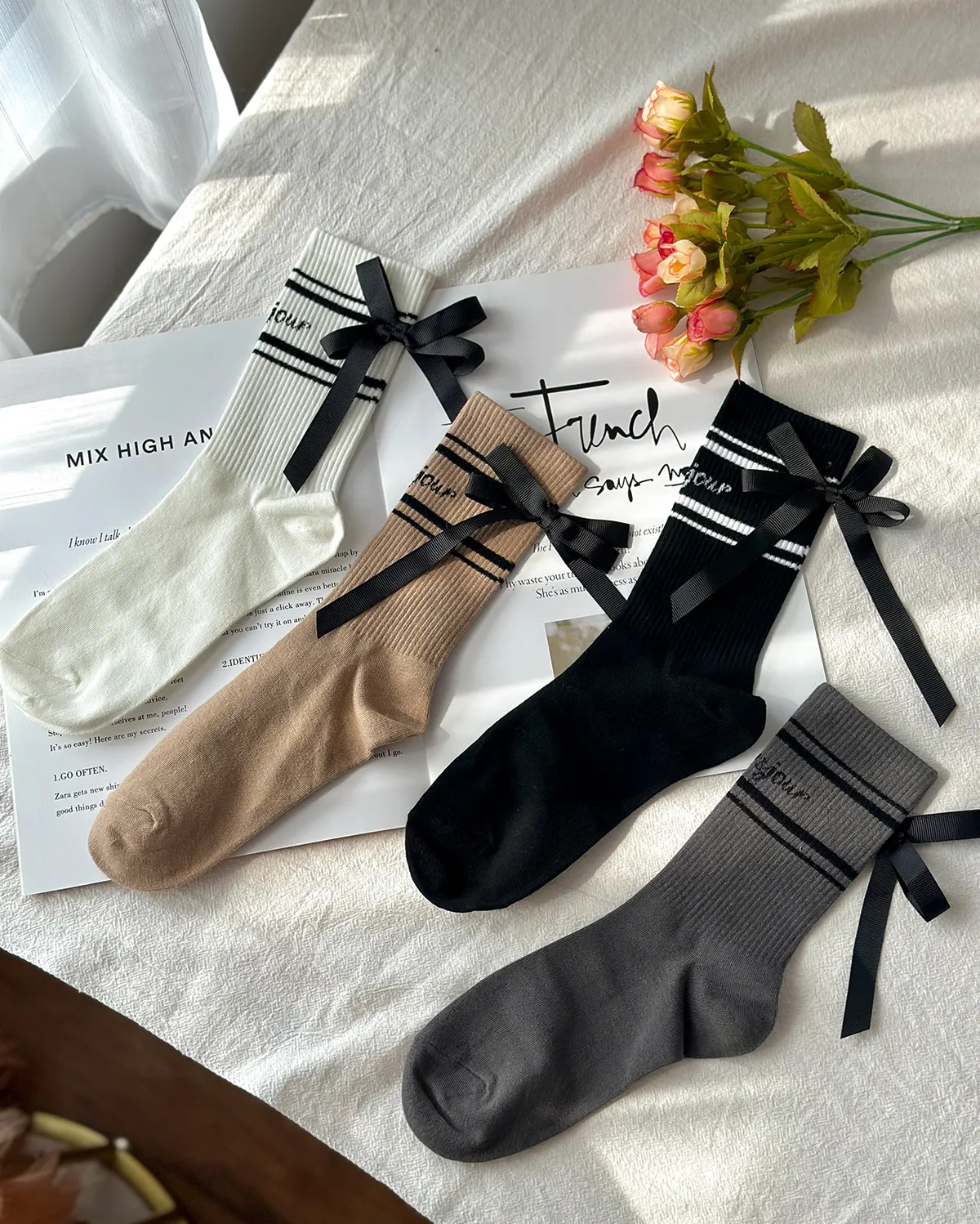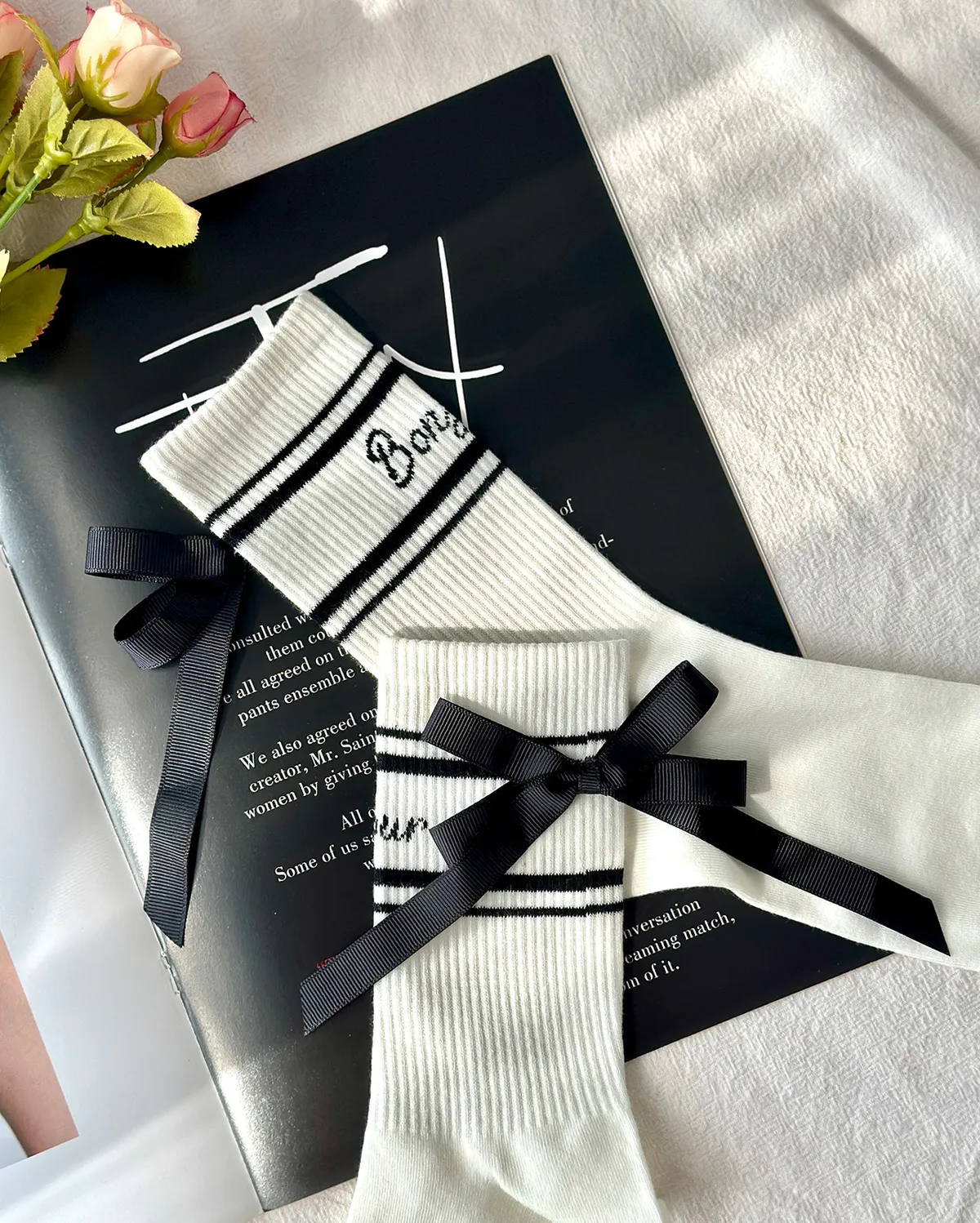 現貨-韓國製 英文立體蝴蝶結中筒襪(共三色)