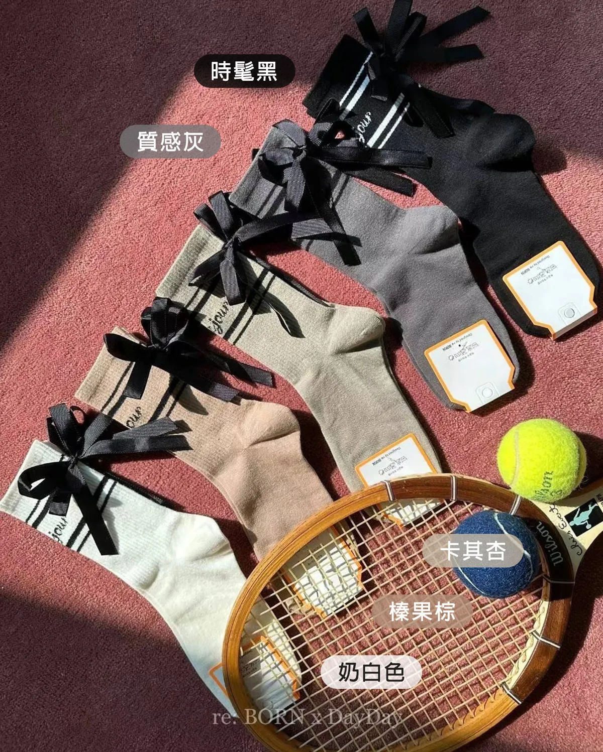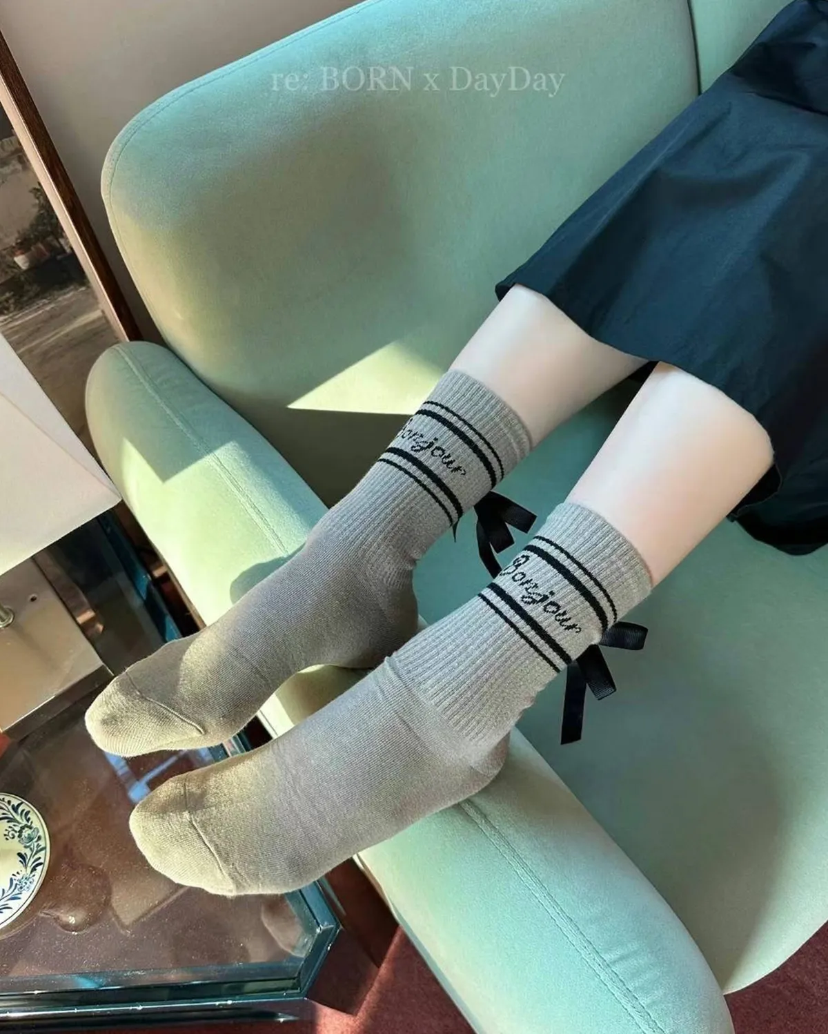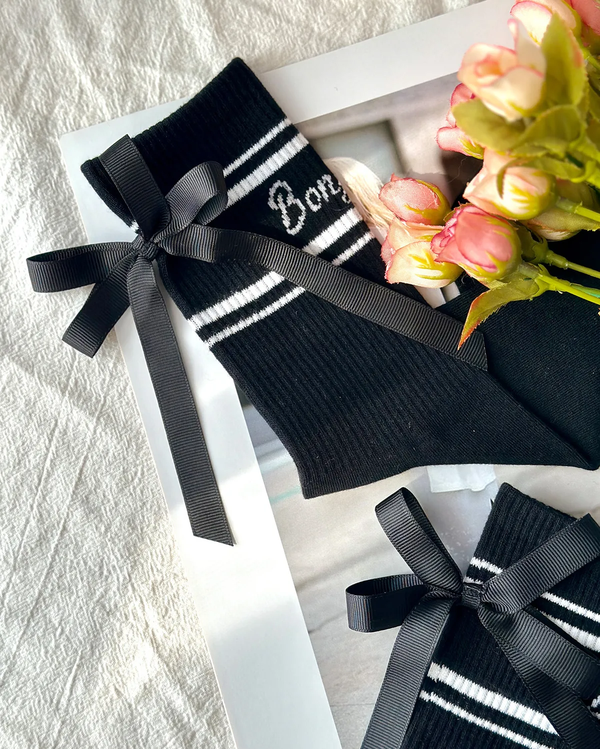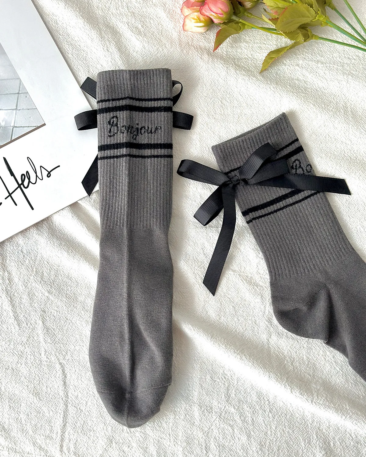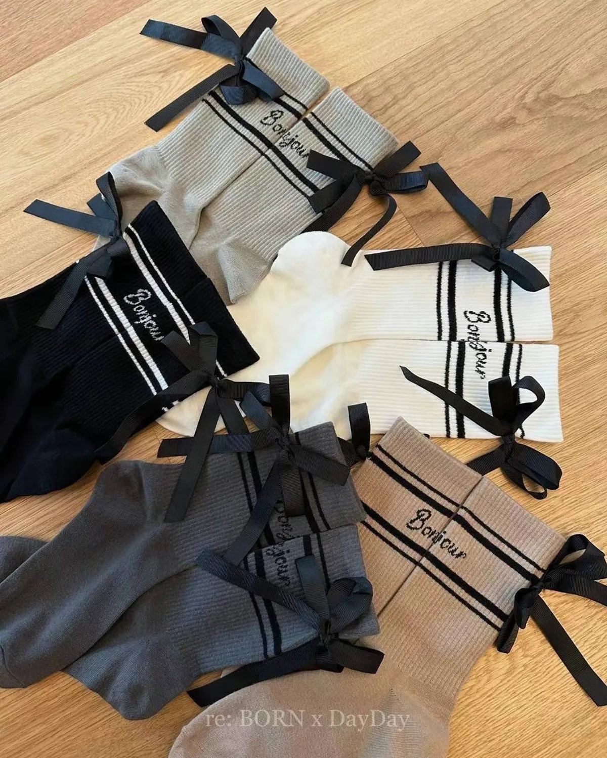 現貨-韓國製 英文立體蝴蝶結中筒襪(共三色)