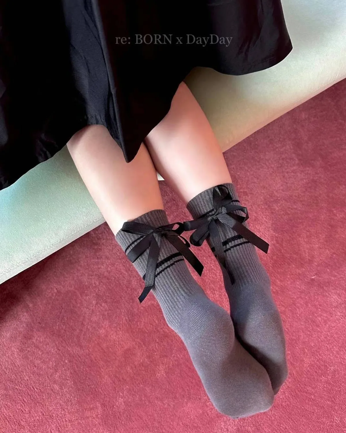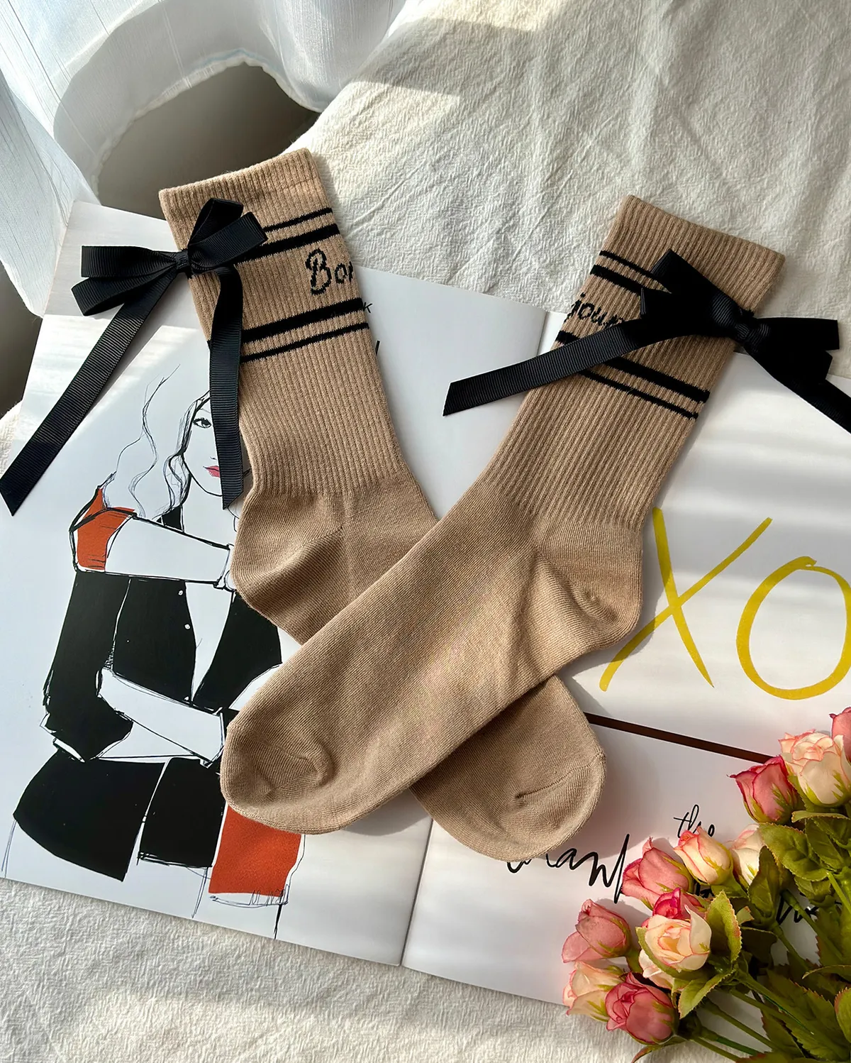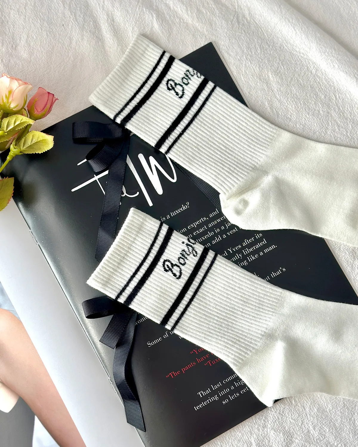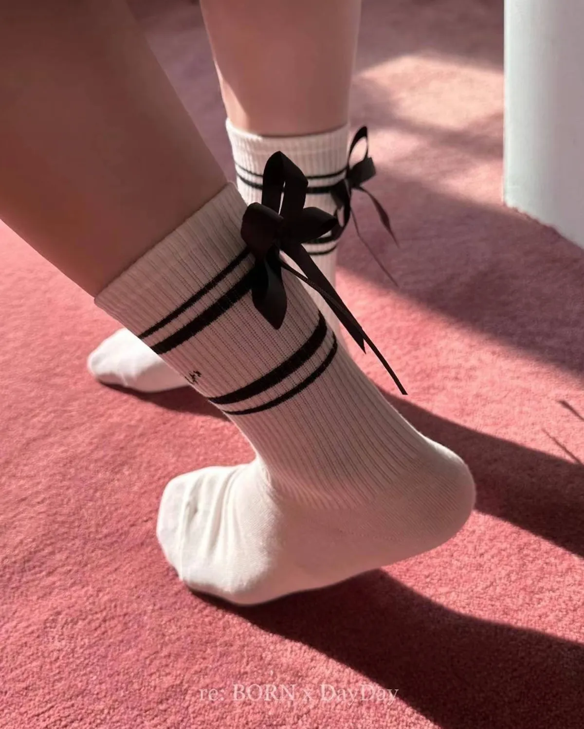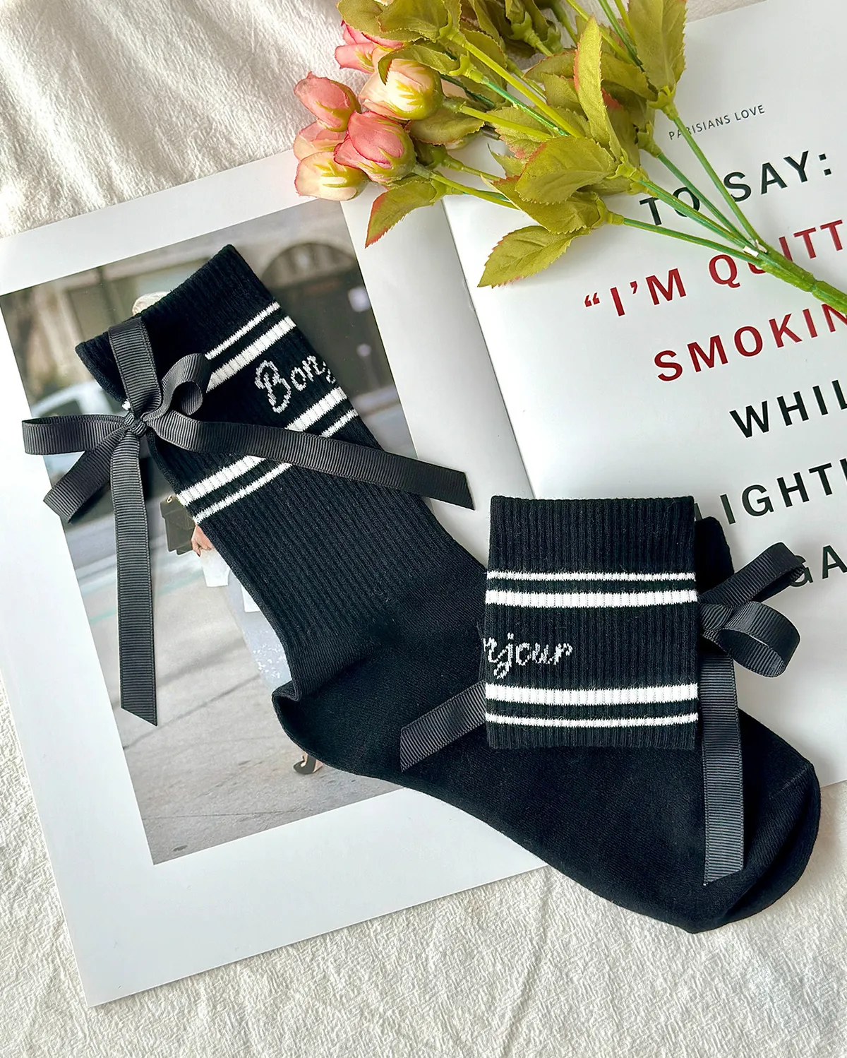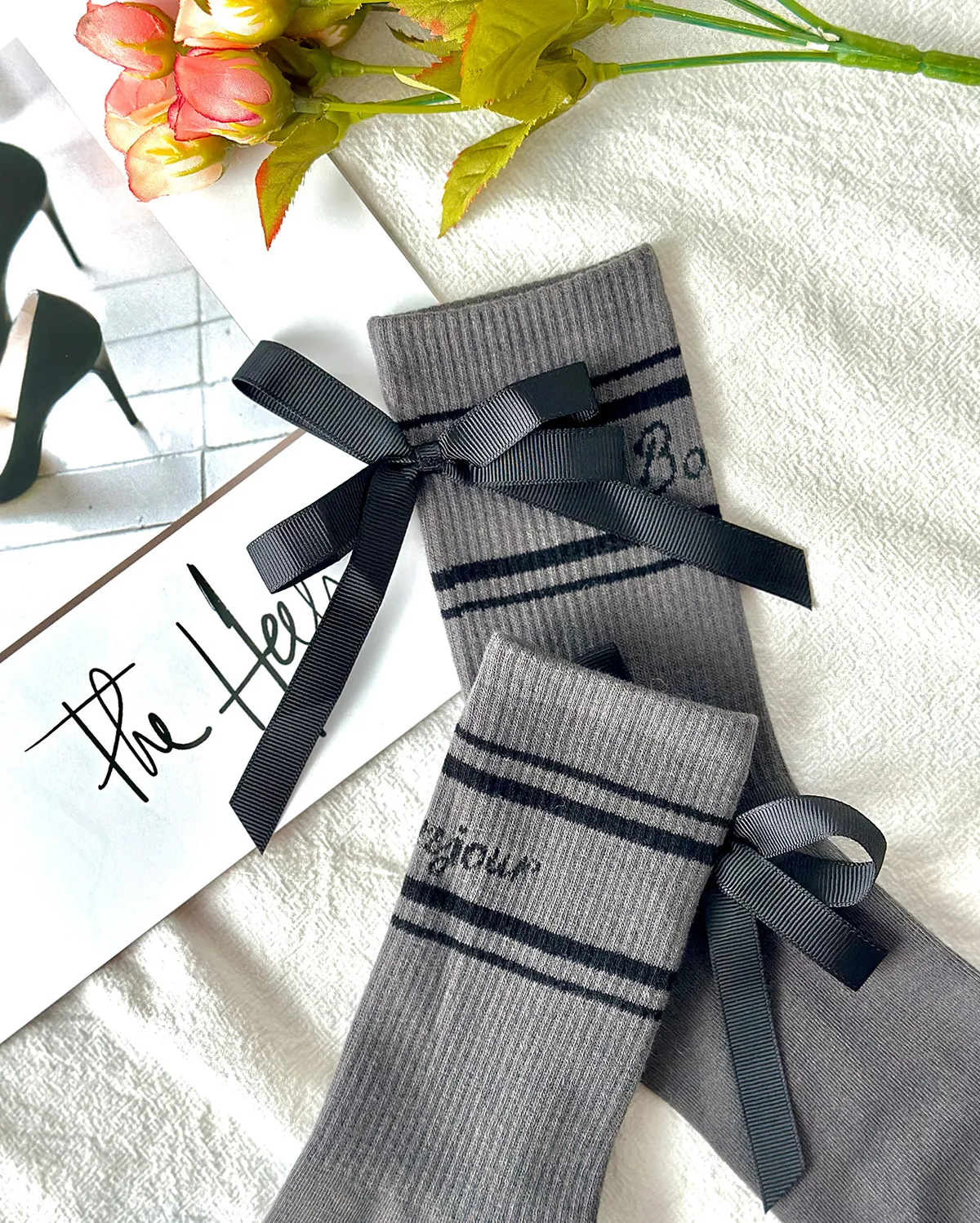 現貨-韓國製 英文立體蝴蝶結中筒襪(共三色)