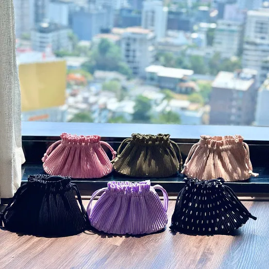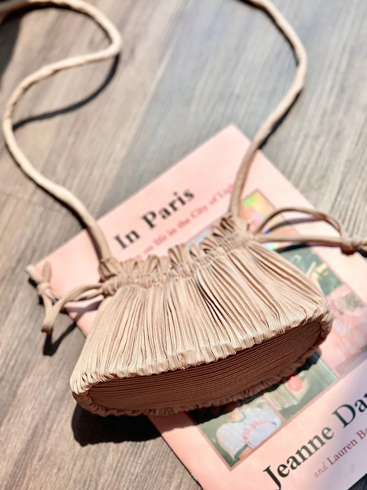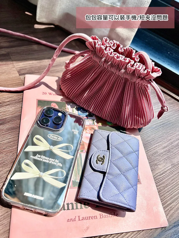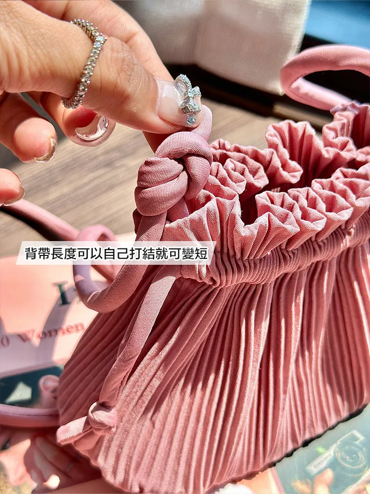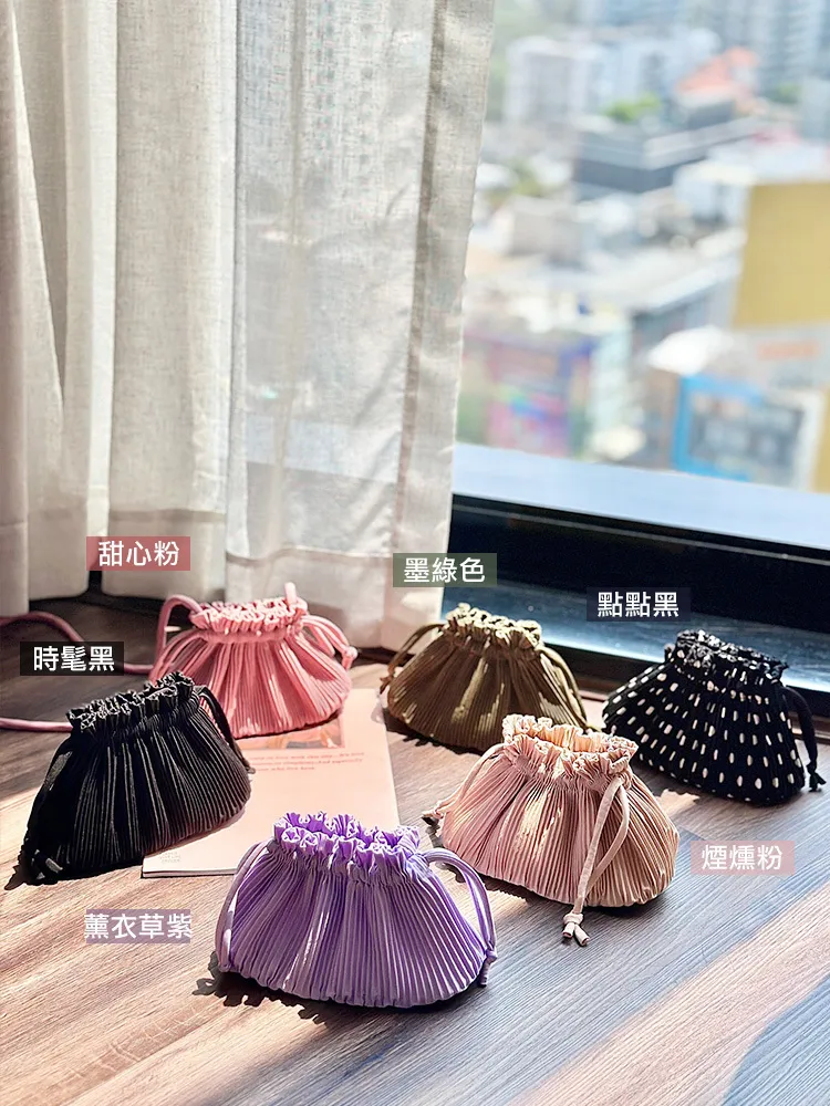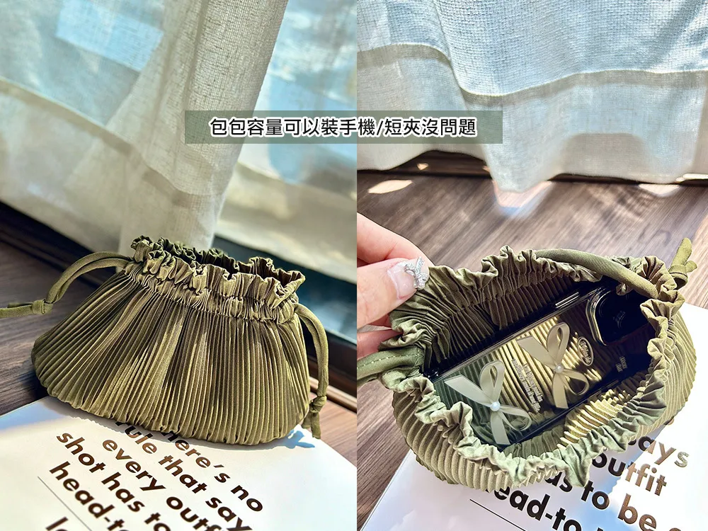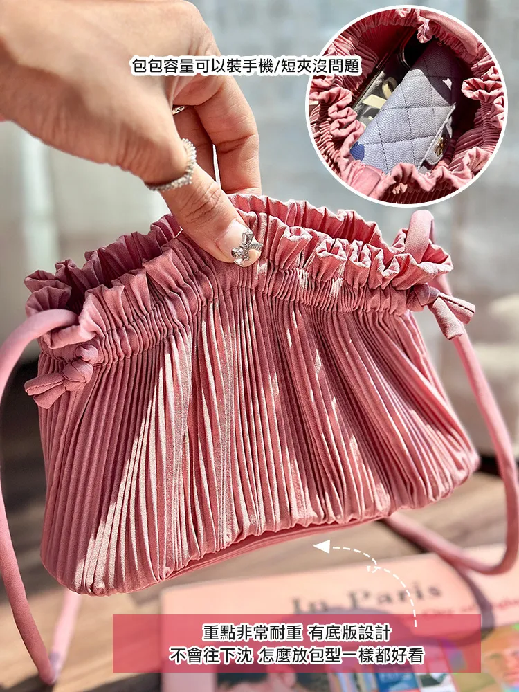 泰國設計師品牌Mini水餃包皺摺設計 造型非常時尚又可愛包包容量可以裝手機/短夾沒問題重點非常耐重 有底版設計不會往下沈 怎麼放包型一樣都好看肩背/斜背任何身高都可駕馭背帶長度可以自己打結就可變短 【尺寸】底長20/底寬9/高13/提把長60cm