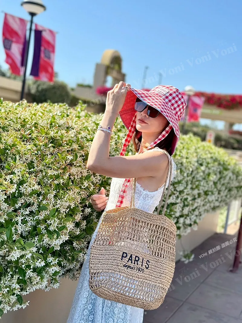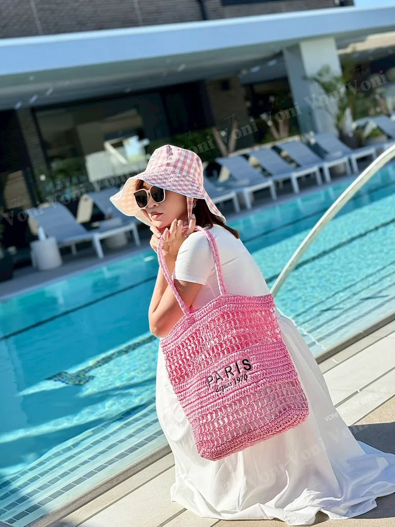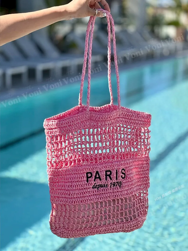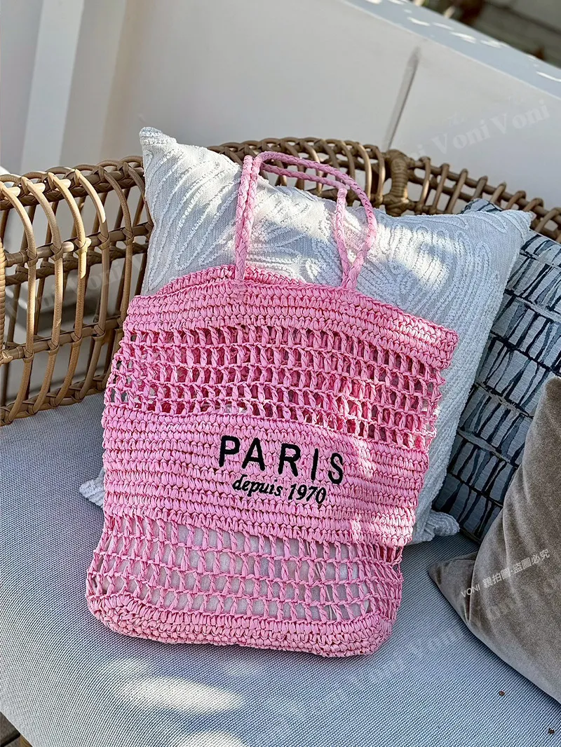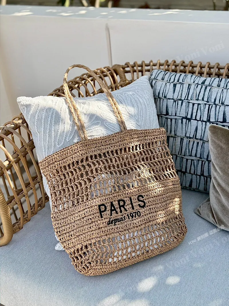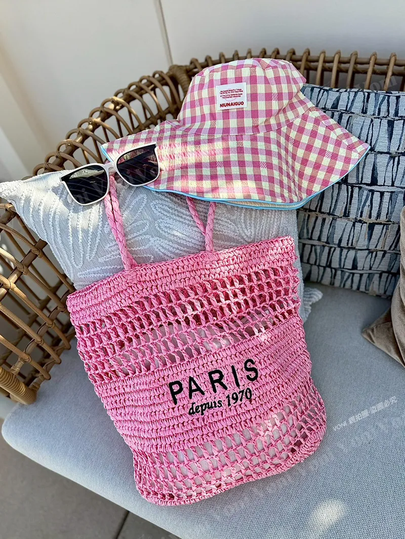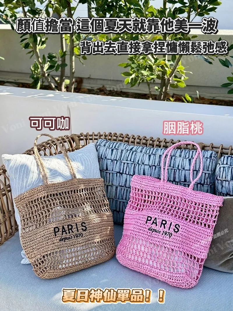 夏日神仙單品 PARIS英文字母刺繡鏤空草編包