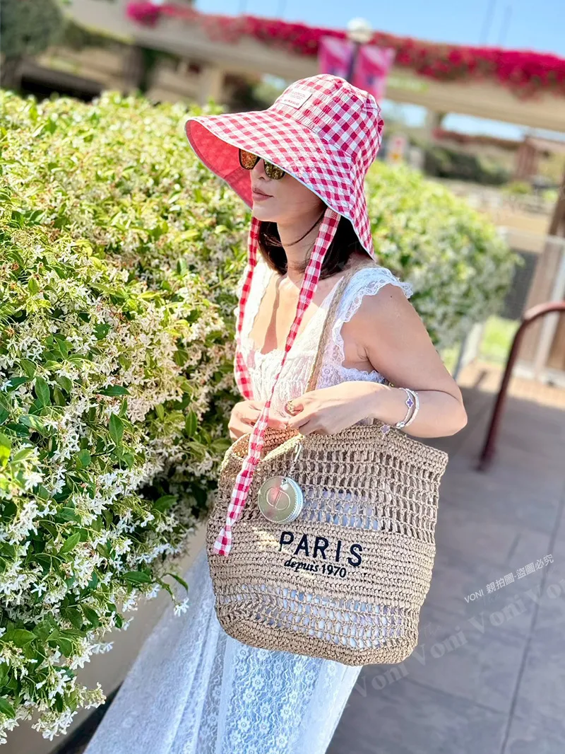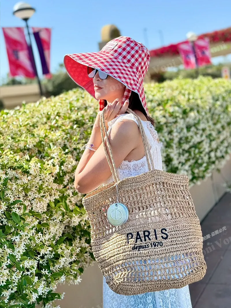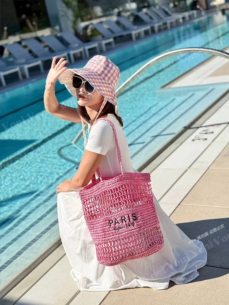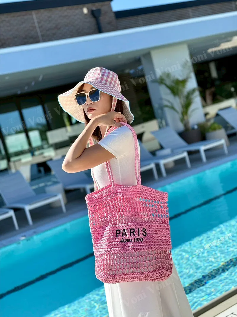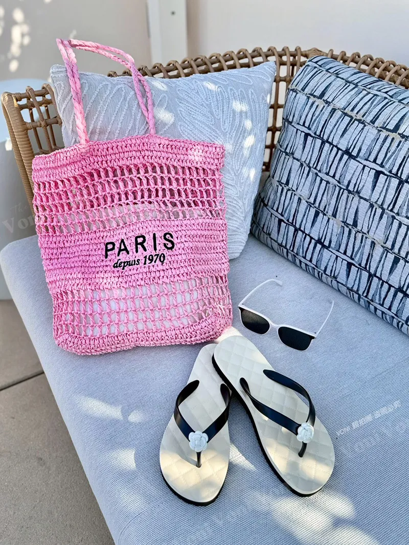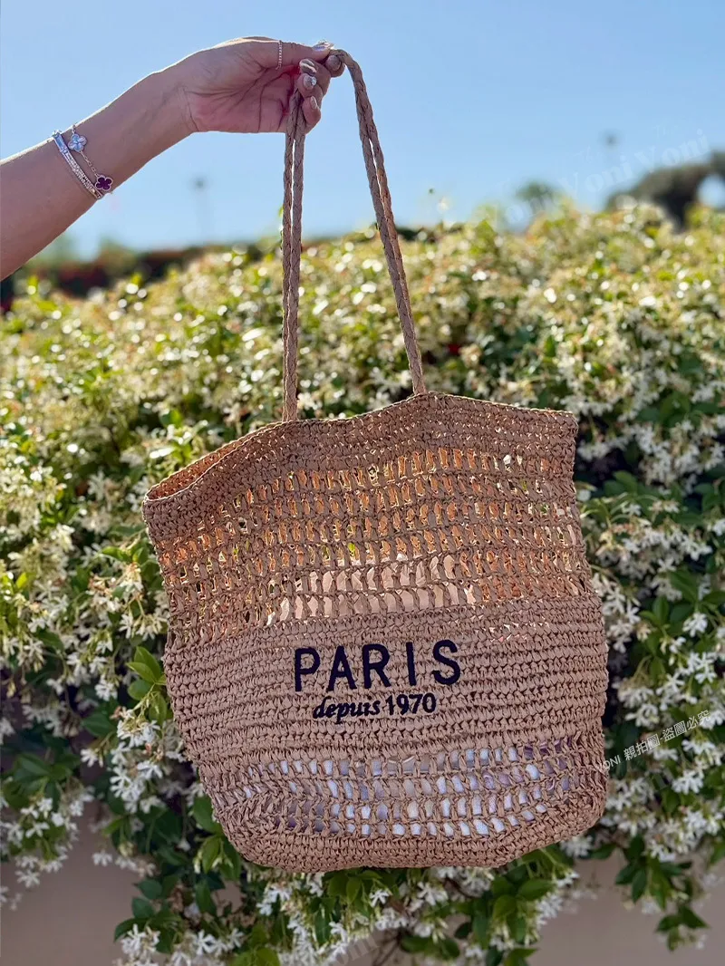 夏日神仙單品 PARIS英文字母刺繡鏤空草編包