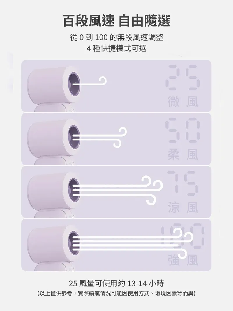 【使用時間】1檔風量可使用約13–14小時