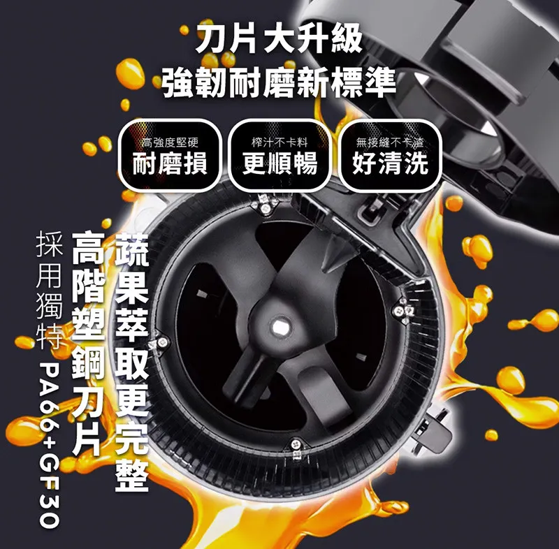 【材料】機身總成、進料蓋、果汁壺:ABS/榨汁桶身、榨汁桶、螺旋擠壓器:PC