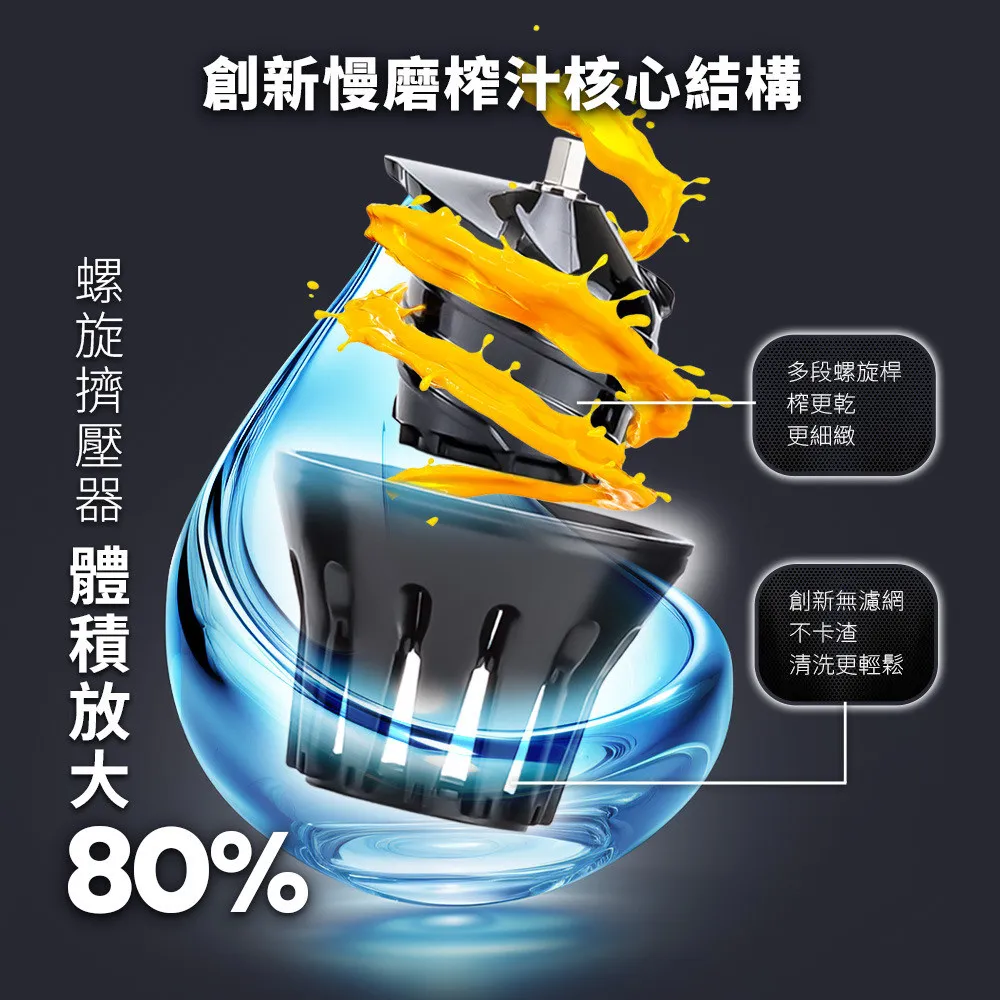 冷壓慢磨技術+放大 80% 螺旋擠壓器