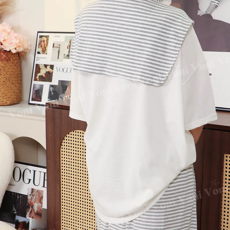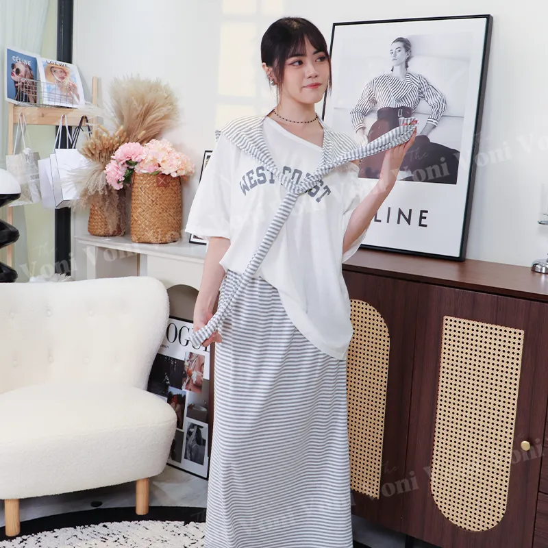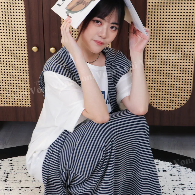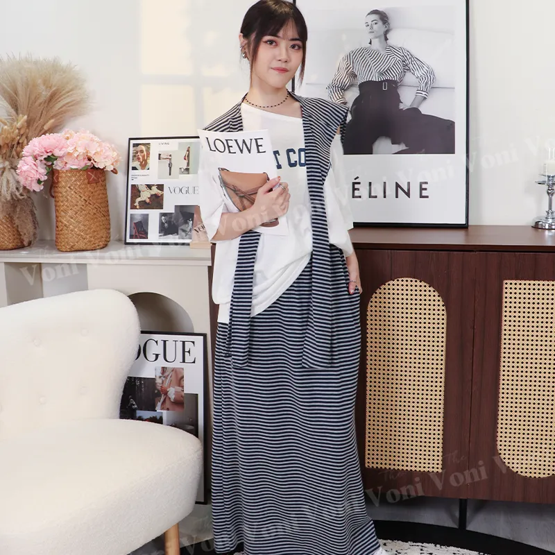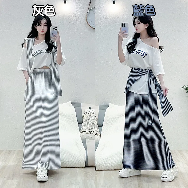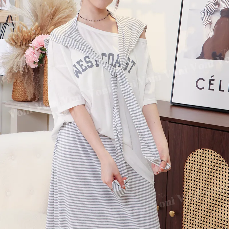 這套直接幫你配好 ➝ 條紋披肩+寬鬆T+長裙,完全不用想搭配,一套就能輕鬆出門