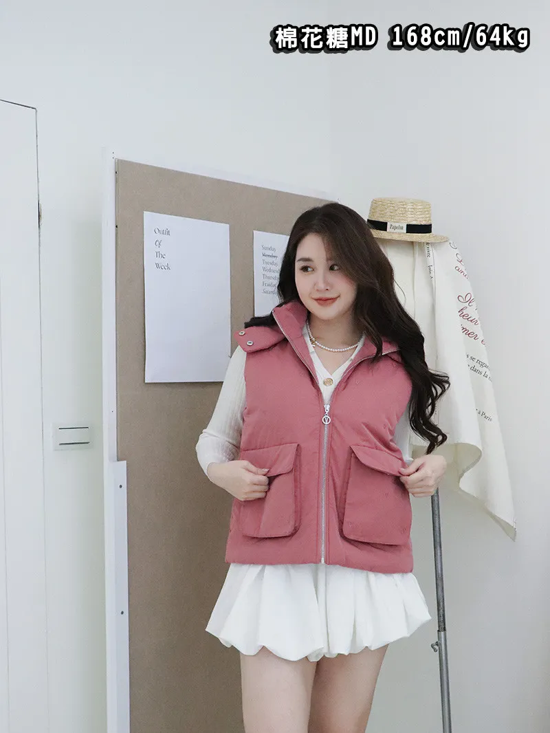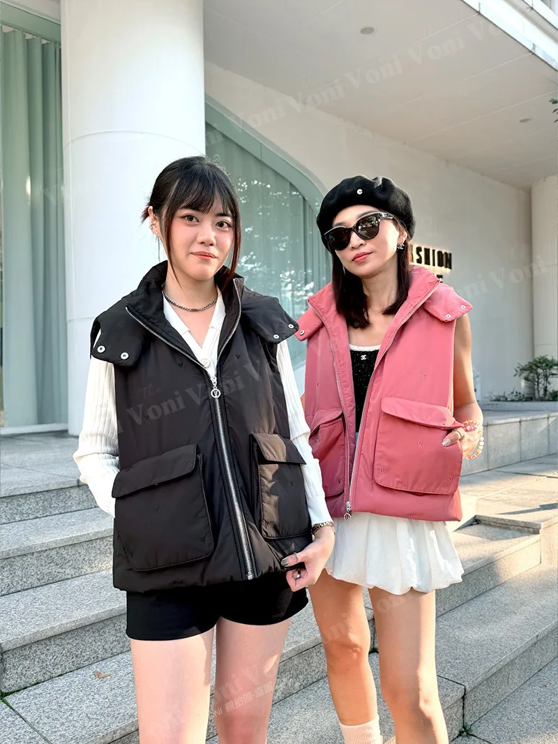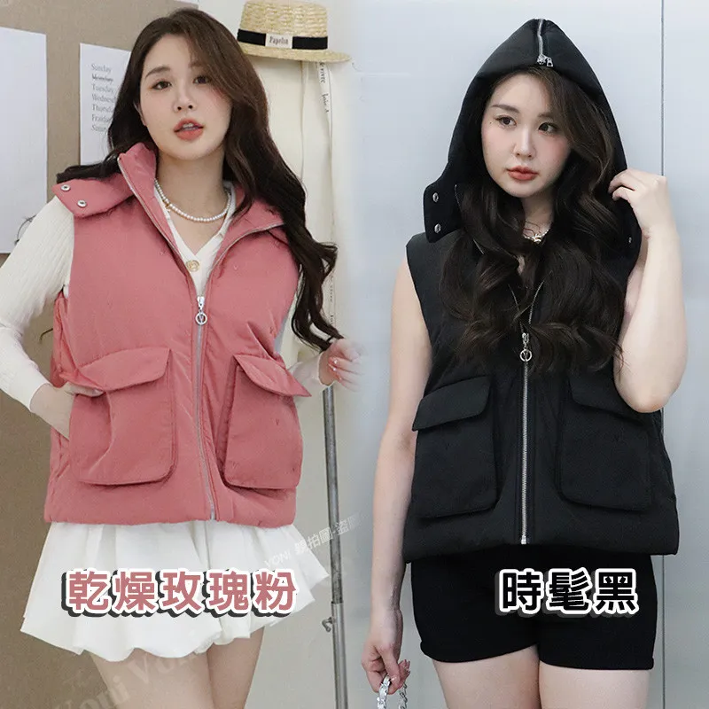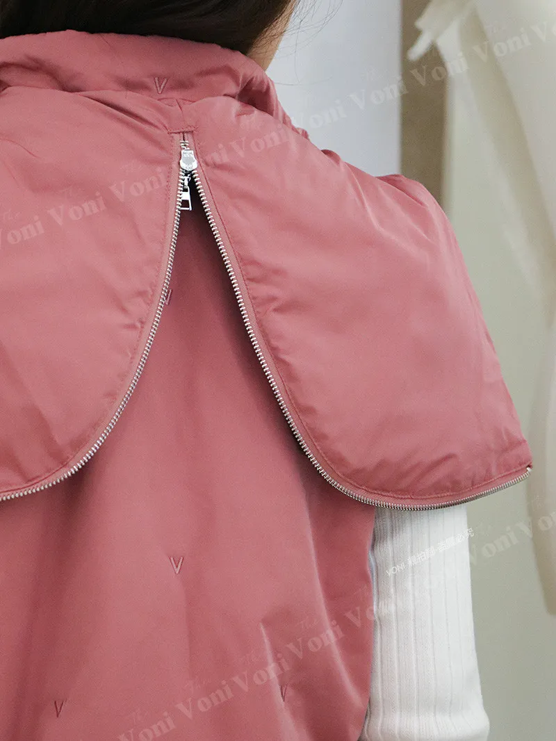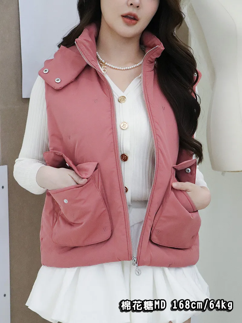 【Voni品牌自訂款.空氣胖 V字刺繡雙口袋可拆連帽 超輕盈鋪棉背心】