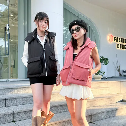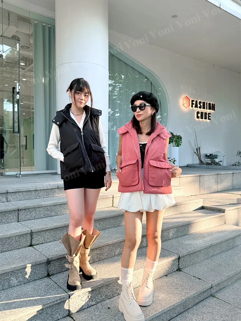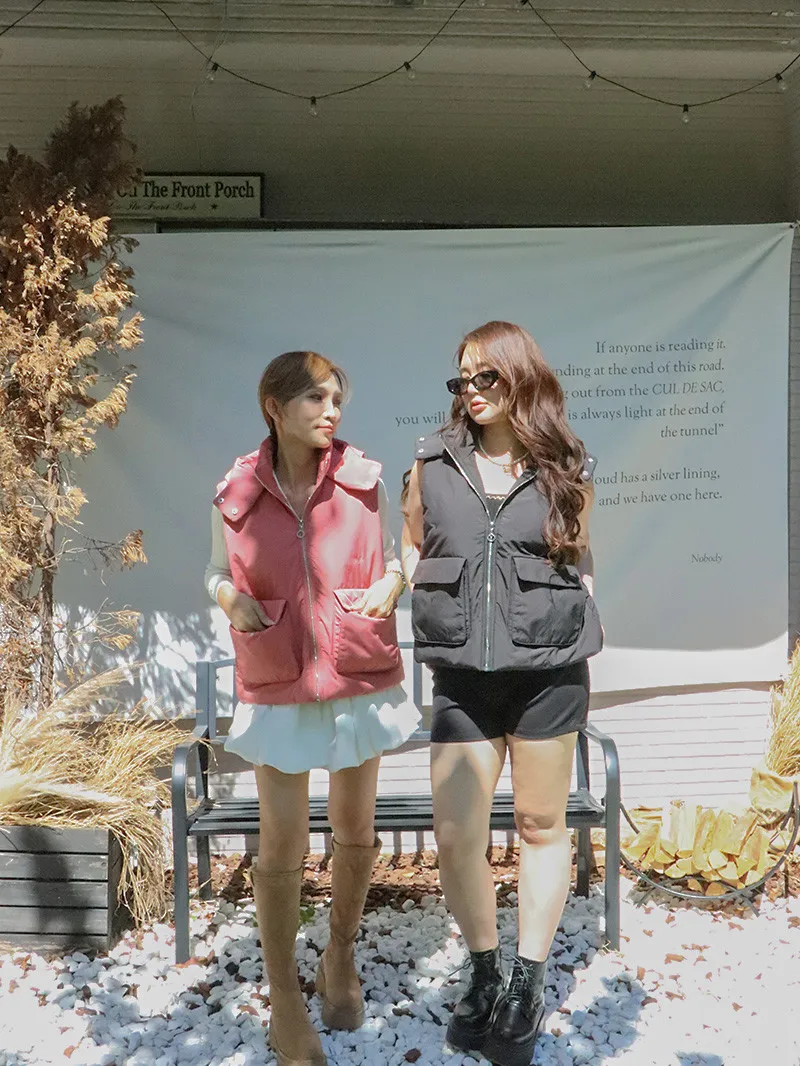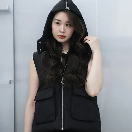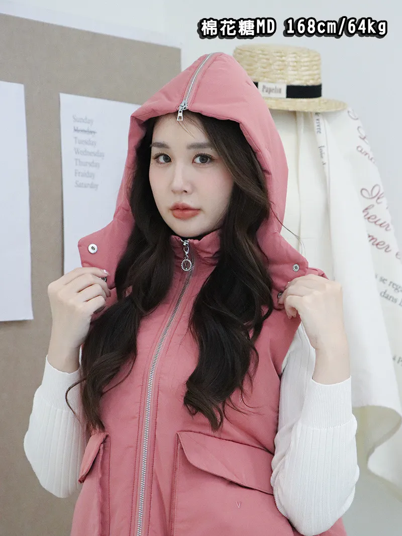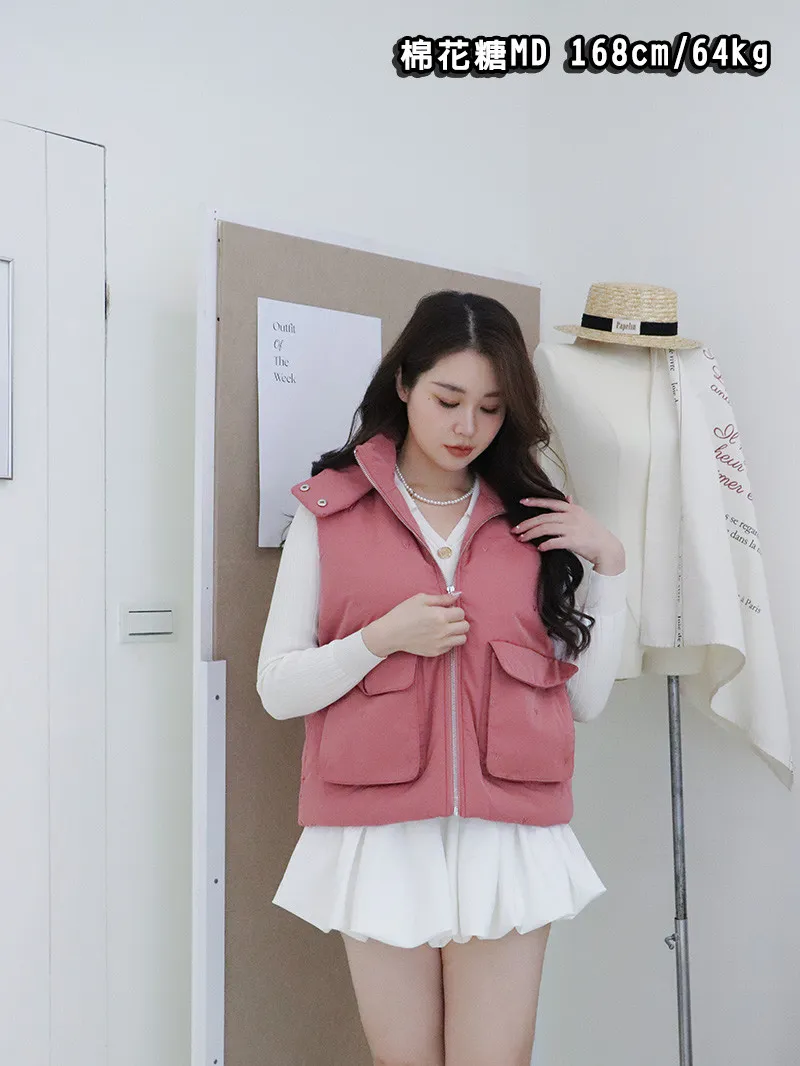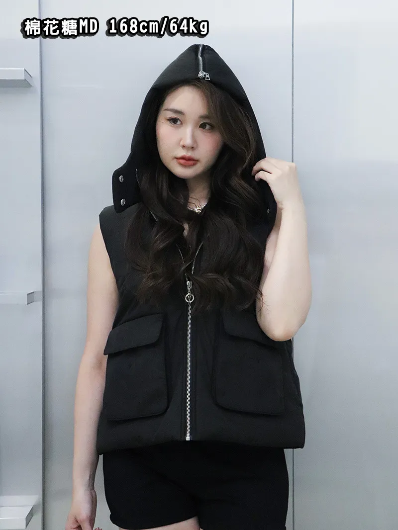 【Voni品牌自訂款.空氣胖 V字刺繡雙口袋可拆連帽 超輕盈鋪棉背心】