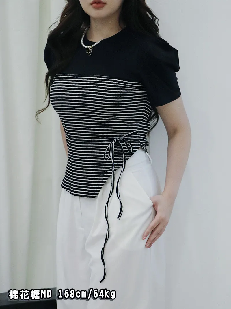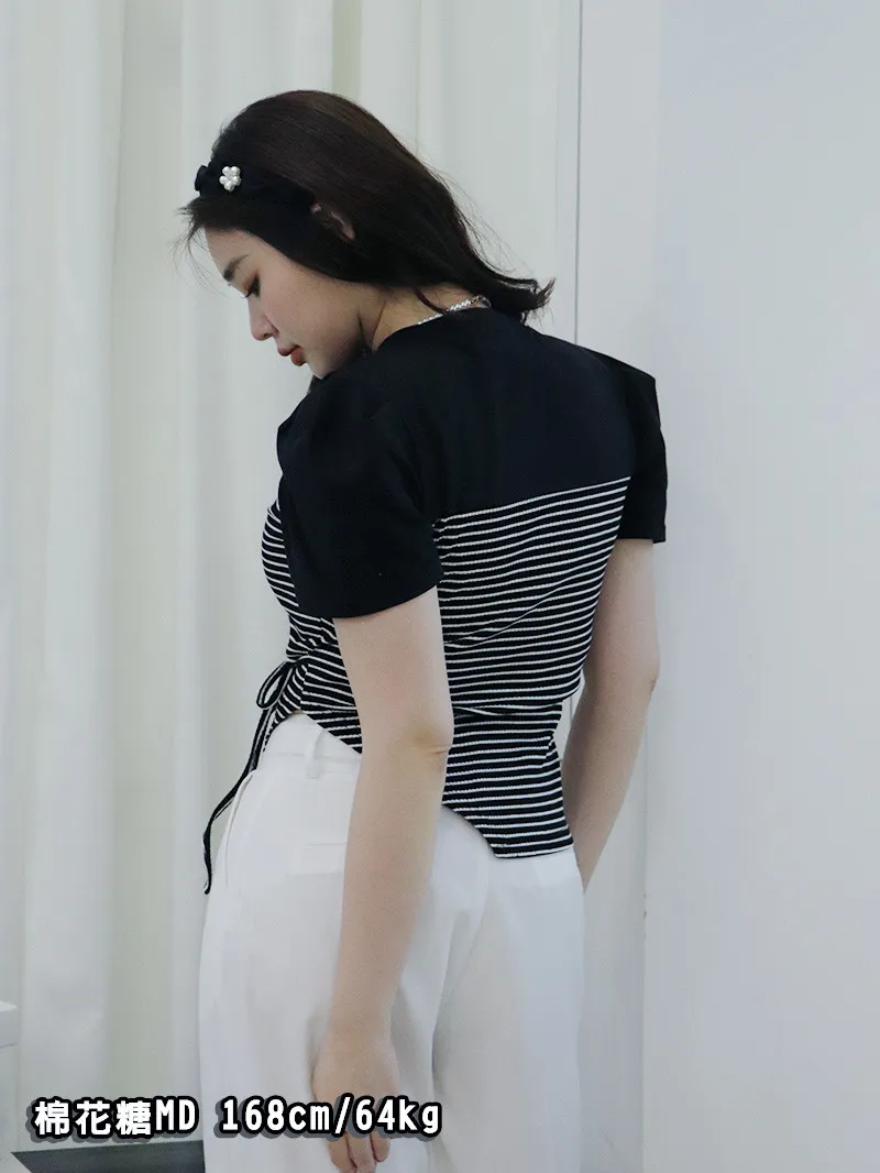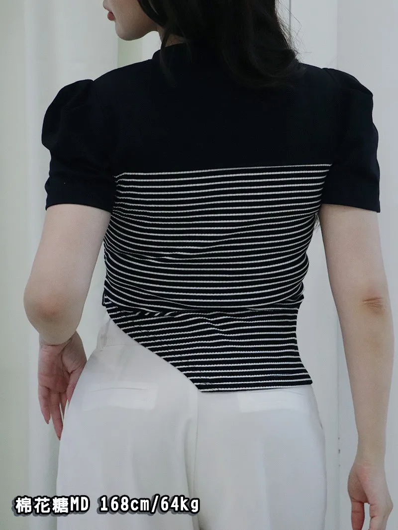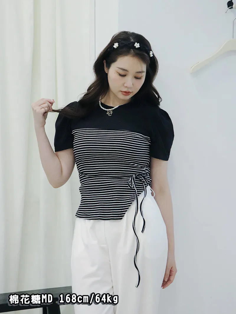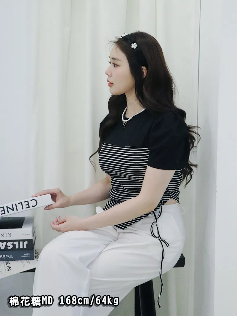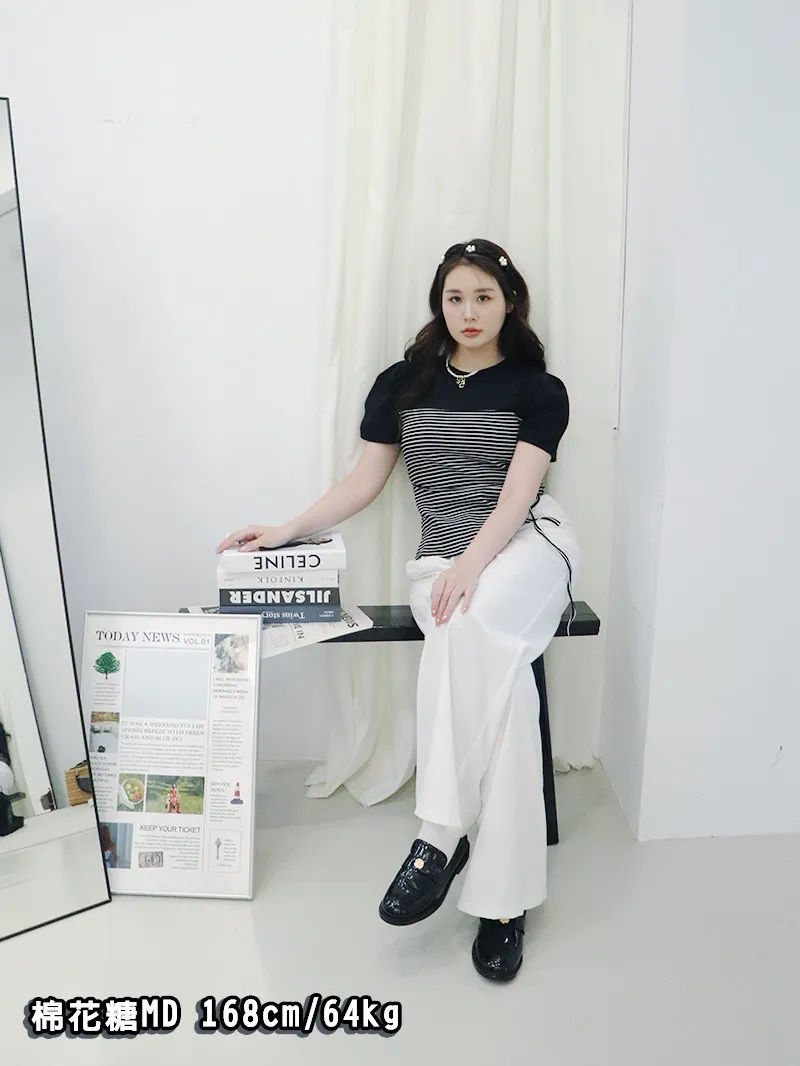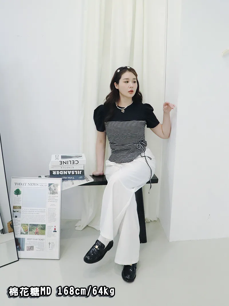 上身小香感條紋拼接,搭配澎澎公主袖+墊肩,修飾手臂與肩線 ➝ 直角肩比例立現!