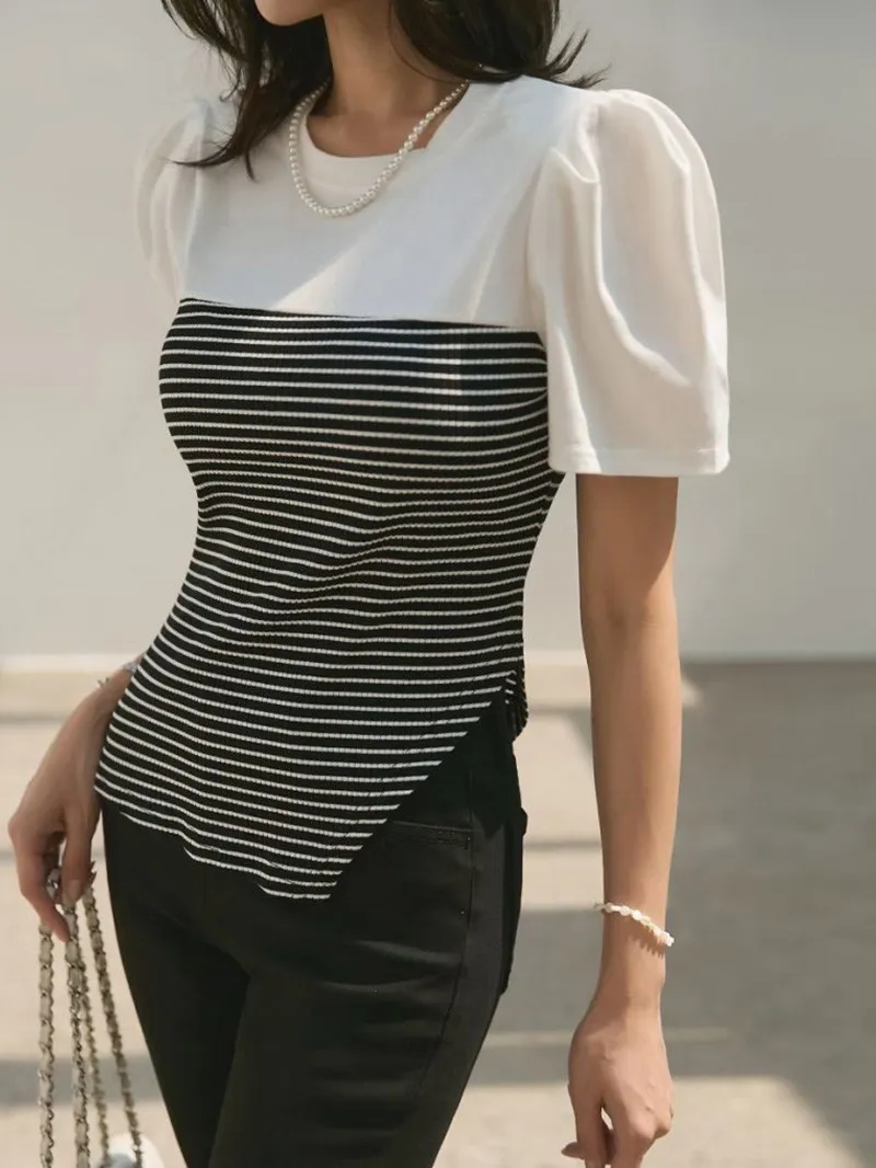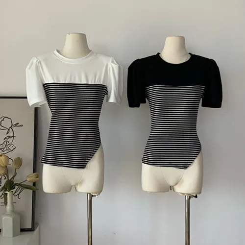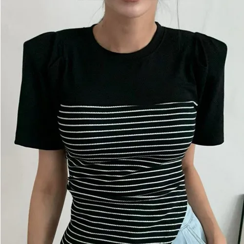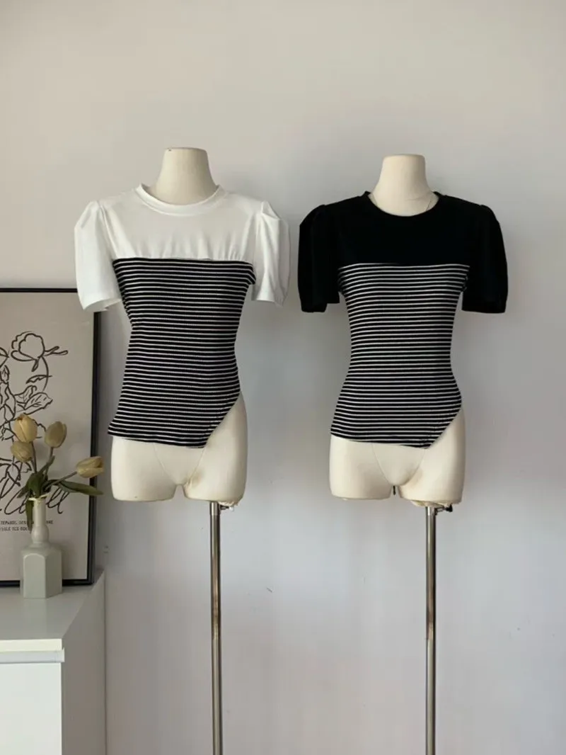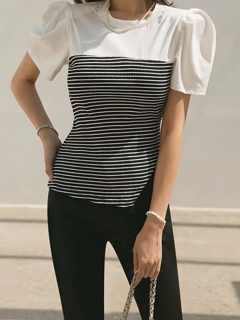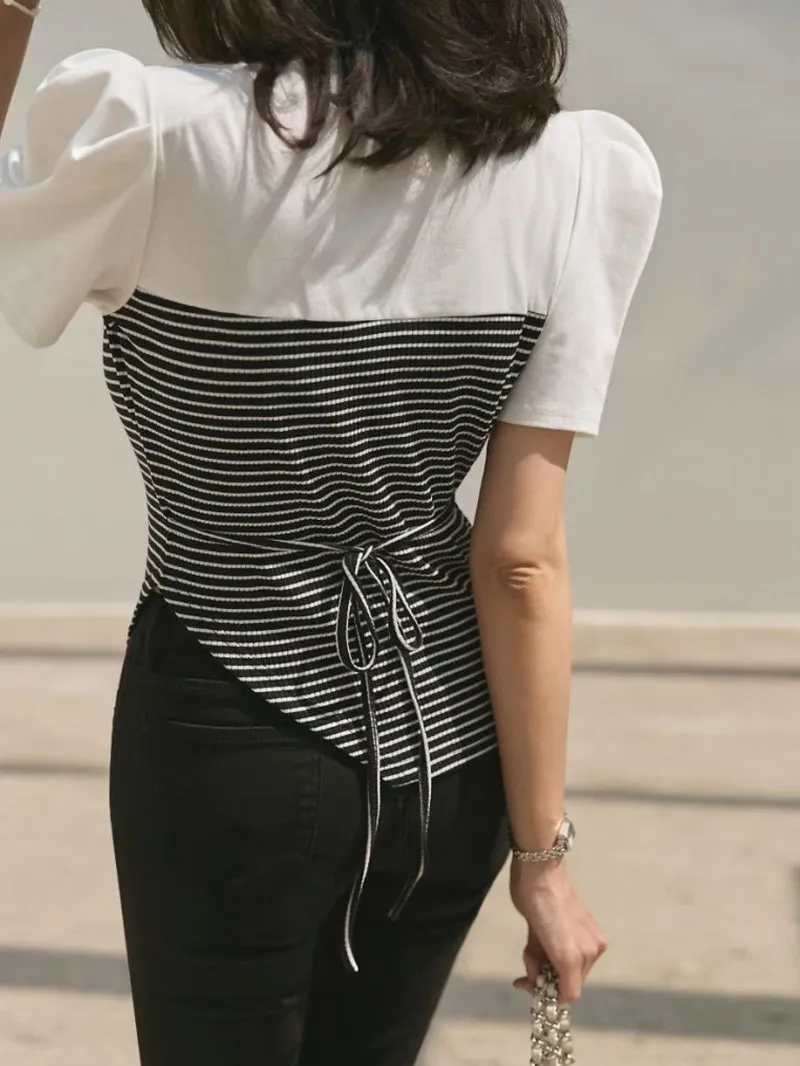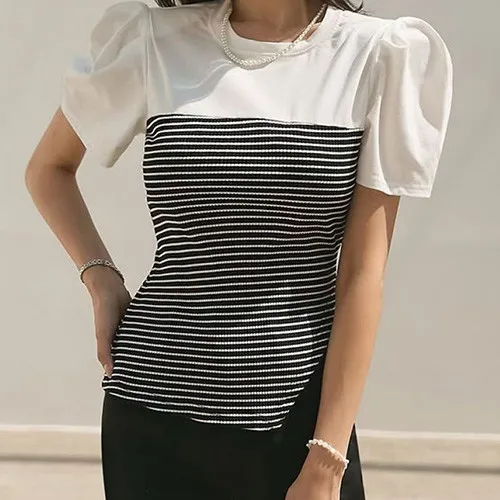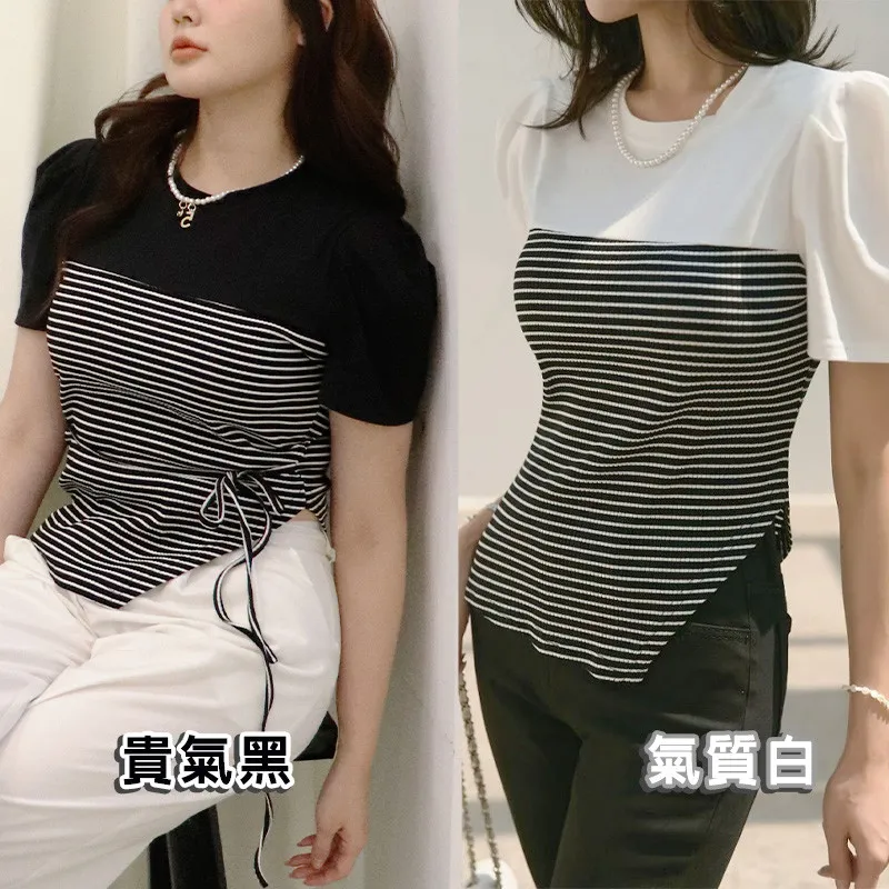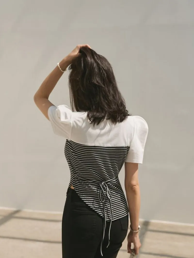 上身小香感條紋拼接,搭配澎澎公主袖+墊肩,修飾手臂與肩線 ➝ 直角肩比例立現!