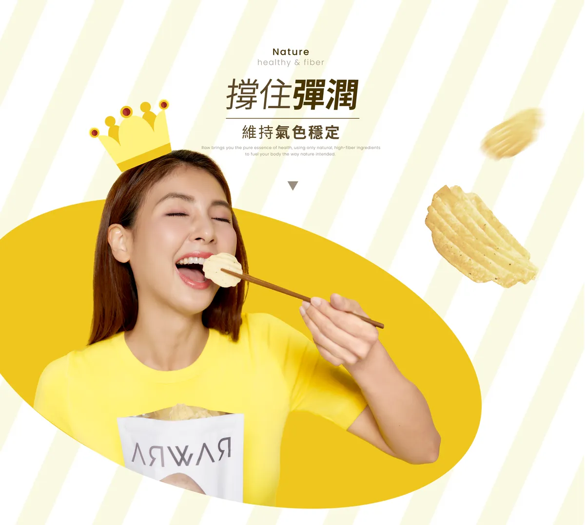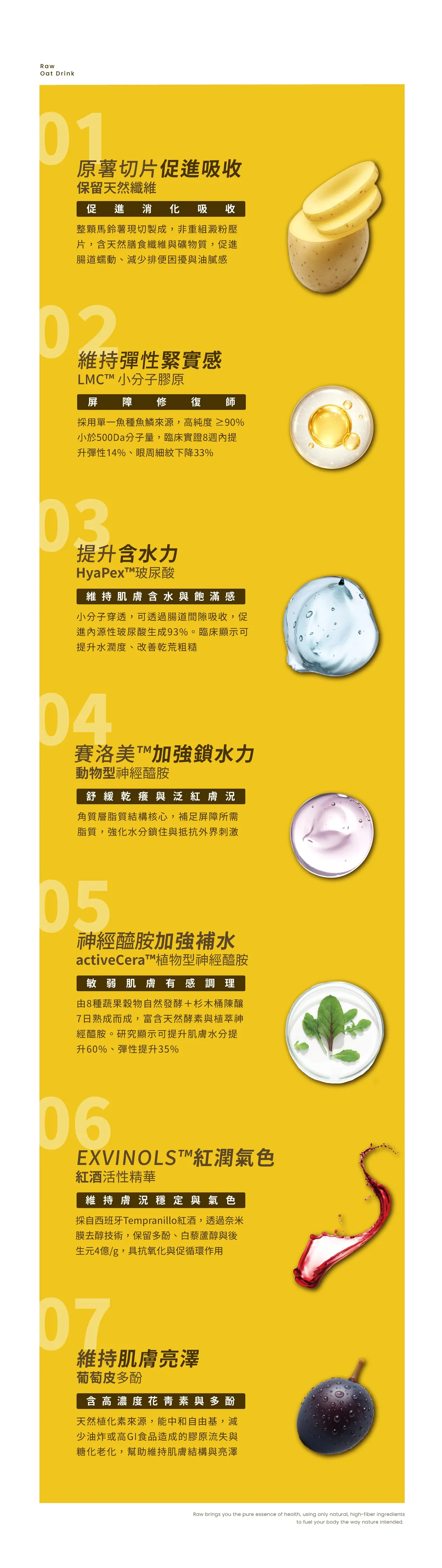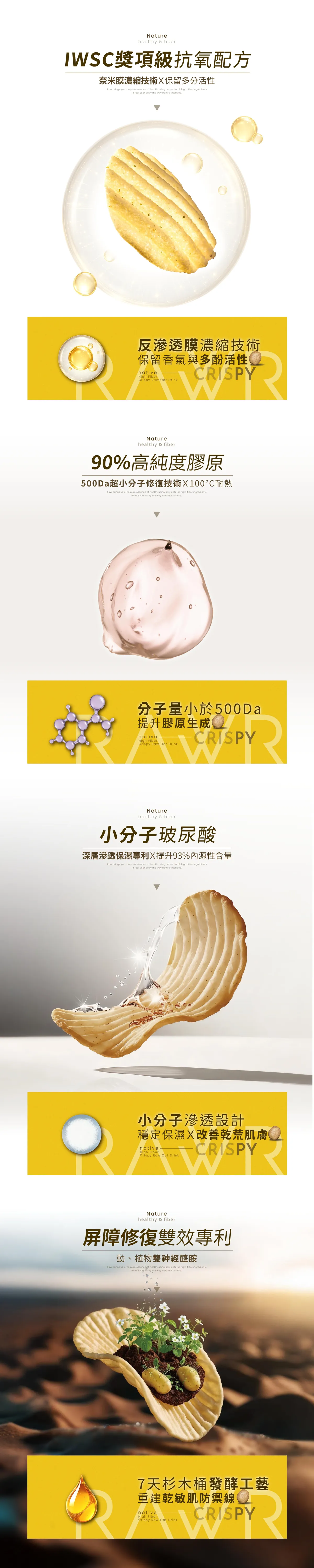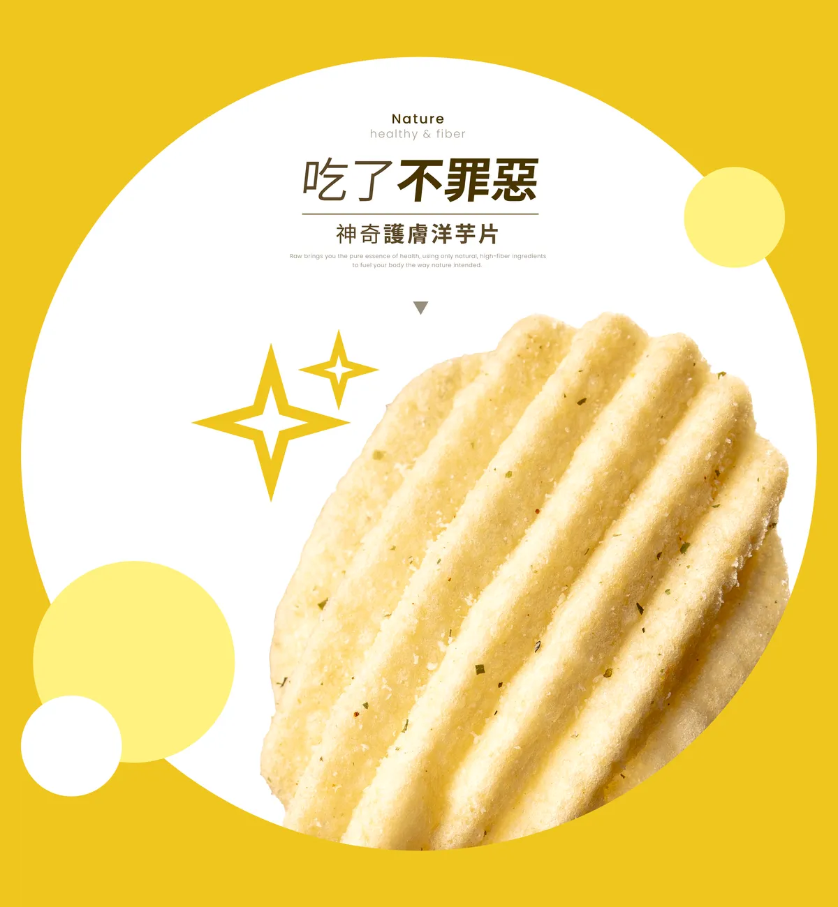 【成分】洋芋片(脫水馬鈴薯、馬鈴薯澱粉、鹽、胡椒、薑黃粉)、棕櫚油、海苔調味粉(麥芽糊精、調味劑(味精、氨基乙酸、DL-胺基丙酸、琥珀酸二鈉、5’–次黃嘌呤核苷磷酸二鈉、5'–鳥嘌呤核苷磷酸二鈉)、鹽、海苔粉、醬油、辣椒粉、甜味劑(蔗糖素)、焦糖色素、大豆油)、難消化麥芽糊精、LMCTM魚膠原蛋白胜肽、ExVinolsTM無酒精紅酒濃縮粉(麥芽糊精、無酒精發酵濃縮葡萄汁、纖維複合粉(難消化麥芽糊精、菊糖、果寡糖)、葡萄籽萃取物、酒石酸、葡萄皮萃取物、啤酒酵母、黑醋栗發酵濃縮液(黑醋栗、諾麗果、水蜜桃)、香料)、activeCera™超級蔬果萃取物(發酵蔬果萃取物(水、果糖、水蜜桃、奇異果、鳳梨、葡萄籽、蒟蒻、菠菜、米、金頂側耳)、環狀糊精)(含神經醯胺)、HyapexTM流行鍊球菌發酵物(含透明質酸鈉)