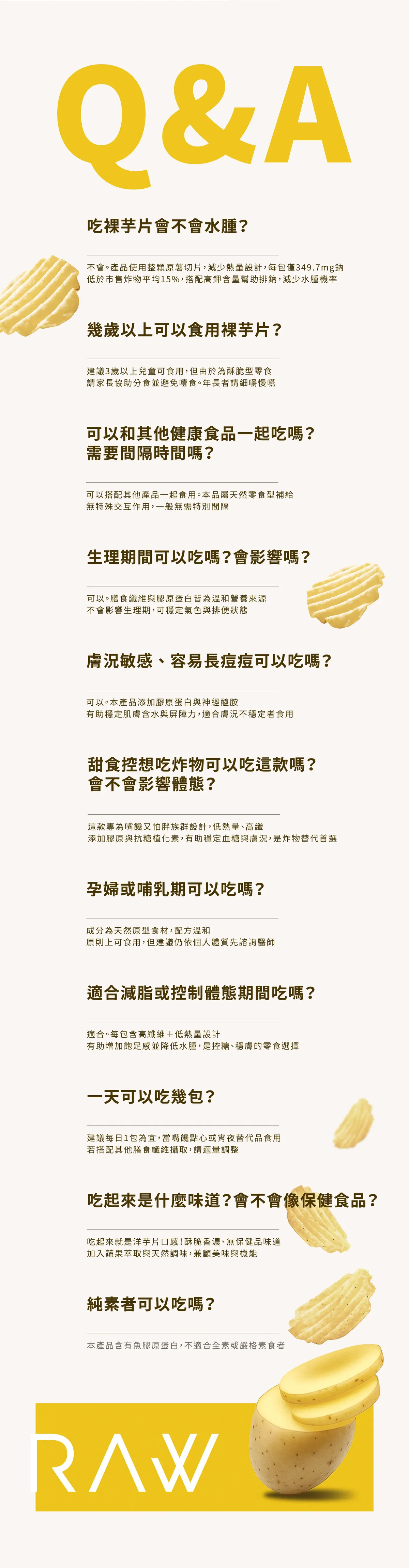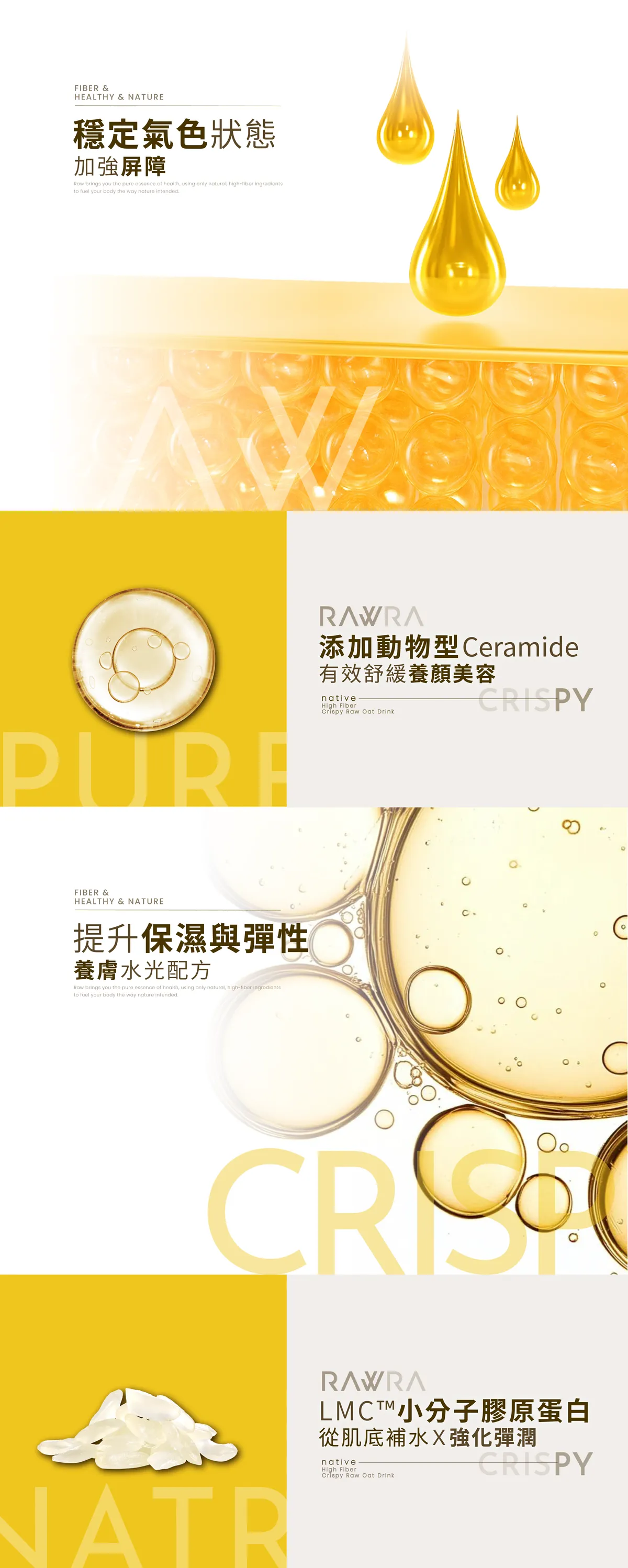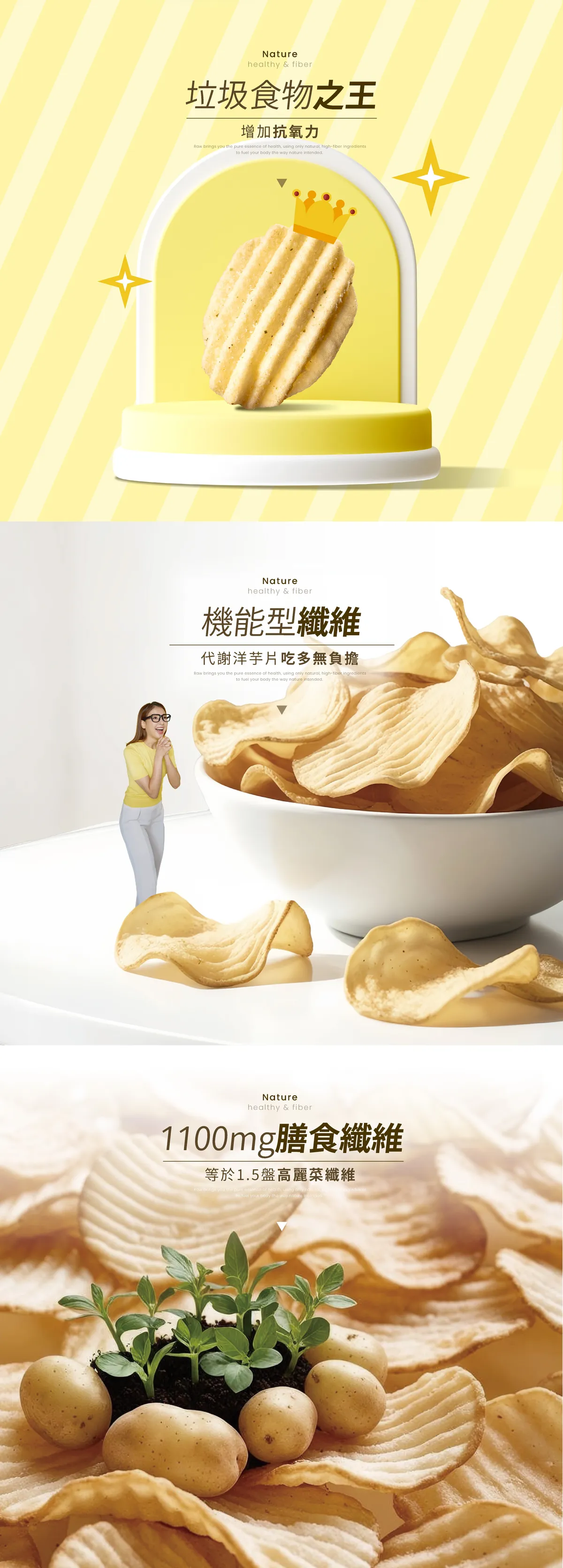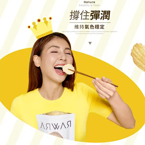 【成分】洋芋片(脫水馬鈴薯、馬鈴薯澱粉、鹽、胡椒、薑黃粉)、棕櫚油、海苔調味粉(麥芽糊精、調味劑(味精、氨基乙酸、DL-胺基丙酸、琥珀酸二鈉、5’–次黃嘌呤核苷磷酸二鈉、5'–鳥嘌呤核苷磷酸二鈉)、鹽、海苔粉、醬油、辣椒粉、甜味劑(蔗糖素)、焦糖色素、大豆油)、難消化麥芽糊精、LMCTM魚膠原蛋白胜肽、ExVinolsTM無酒精紅酒濃縮粉(麥芽糊精、無酒精發酵濃縮葡萄汁、纖維複合粉(難消化麥芽糊精、菊糖、果寡糖)、葡萄籽萃取物、酒石酸、葡萄皮萃取物、啤酒酵母、黑醋栗發酵濃縮液(黑醋栗、諾麗果、水蜜桃)、香料)、activeCera™超級蔬果萃取物(發酵蔬果萃取物(水、果糖、水蜜桃、奇異果、鳳梨、葡萄籽、蒟蒻、菠菜、米、金頂側耳)、環狀糊精)(含神經醯胺)、HyapexTM流行鍊球菌發酵物(含透明質酸鈉)