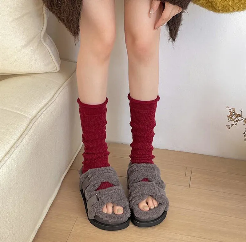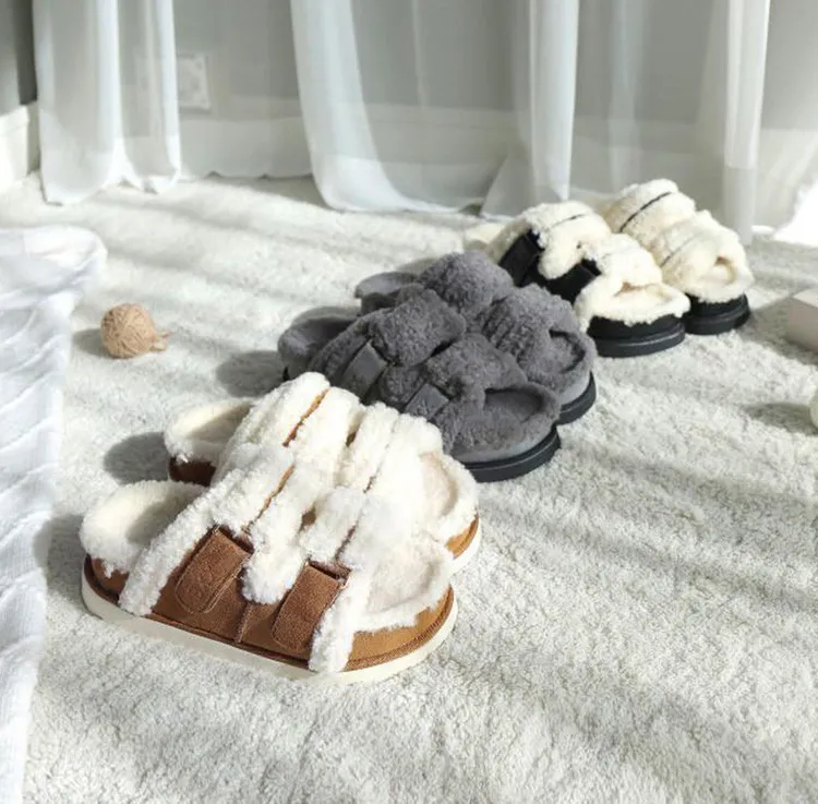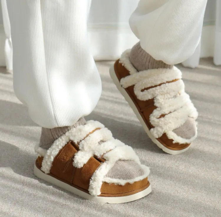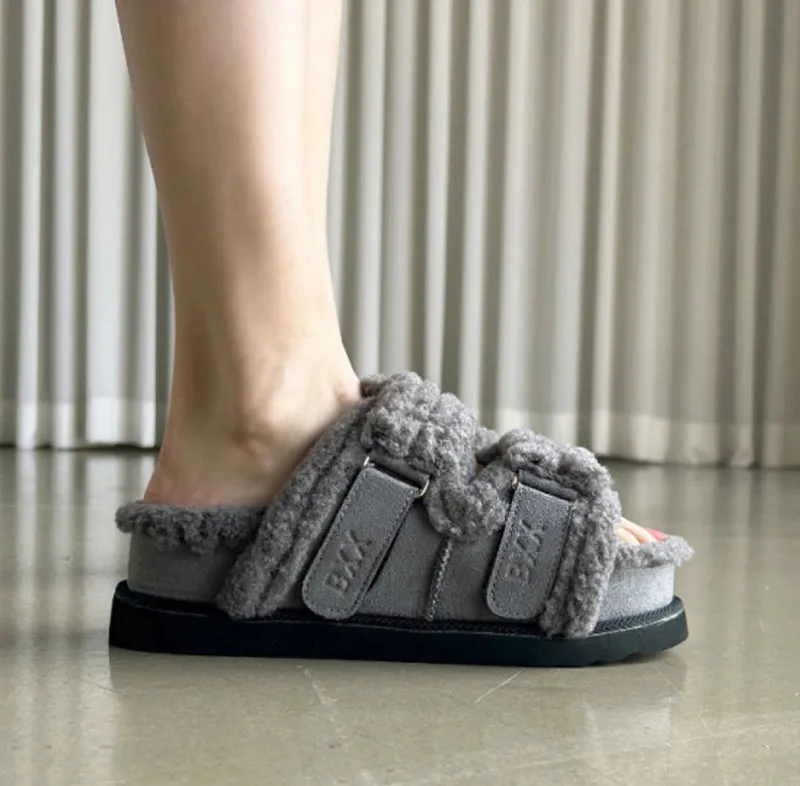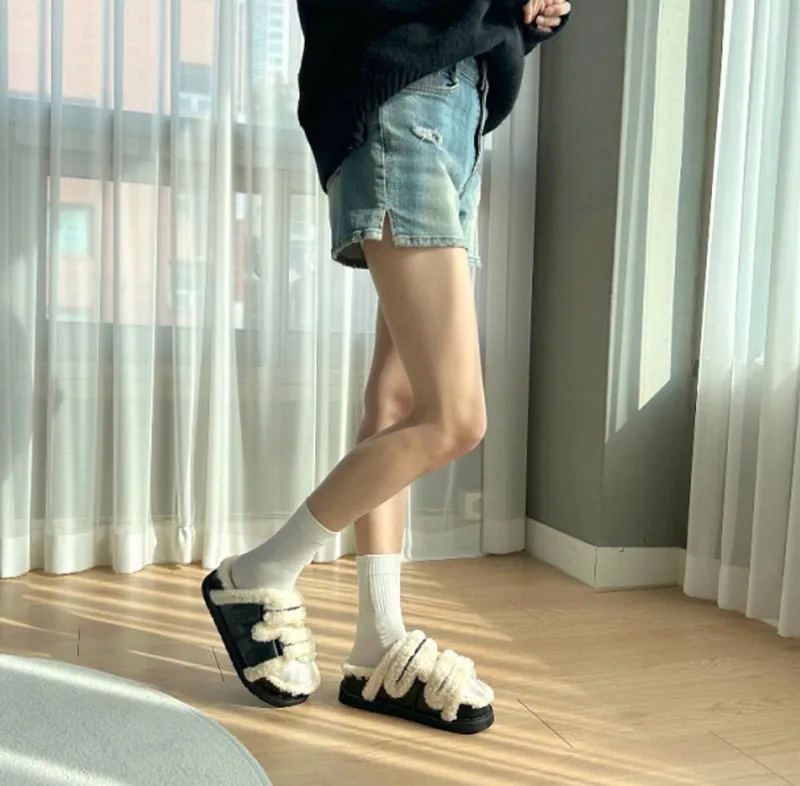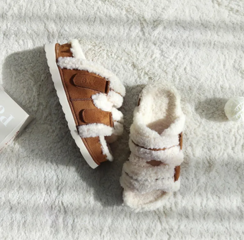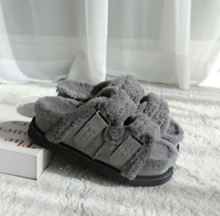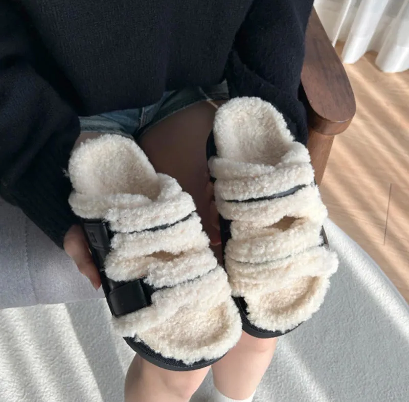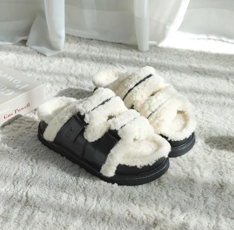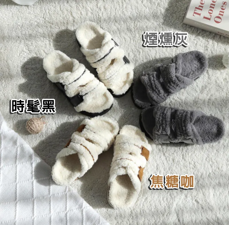 暖呼呼羊羔毛 雙條魔鬼氈厚底勃肯毛毛拖鞋