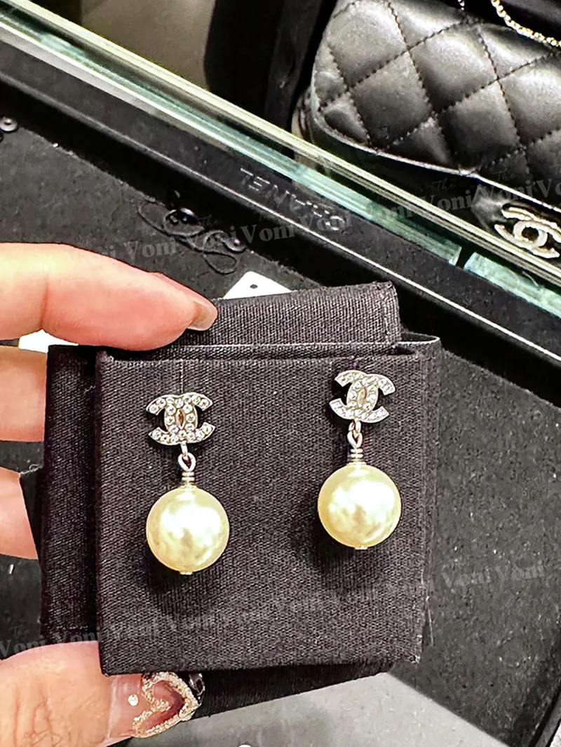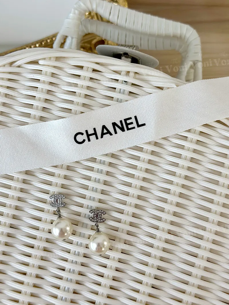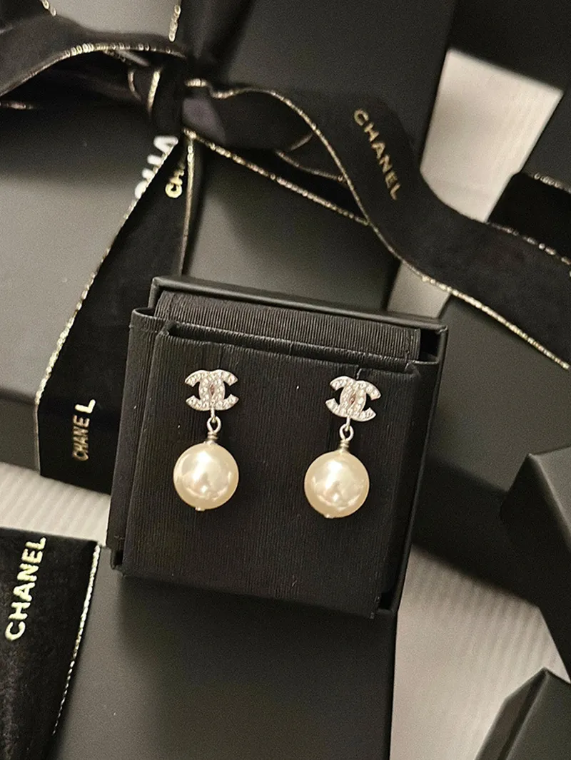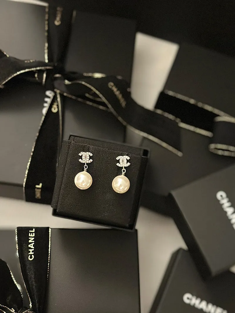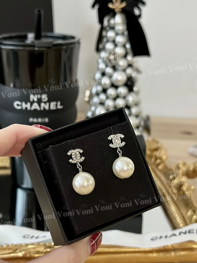 現貨-CHANEL 水鑽鑲嵌珍珠墜飾耳環(黑金緞帶聖誕包裝)