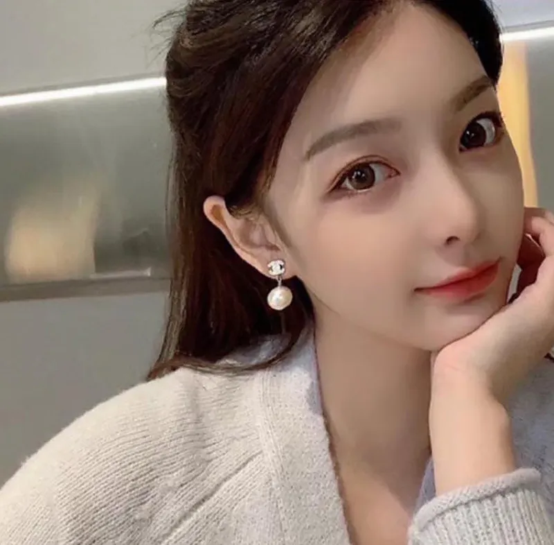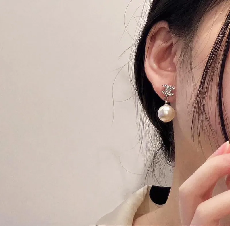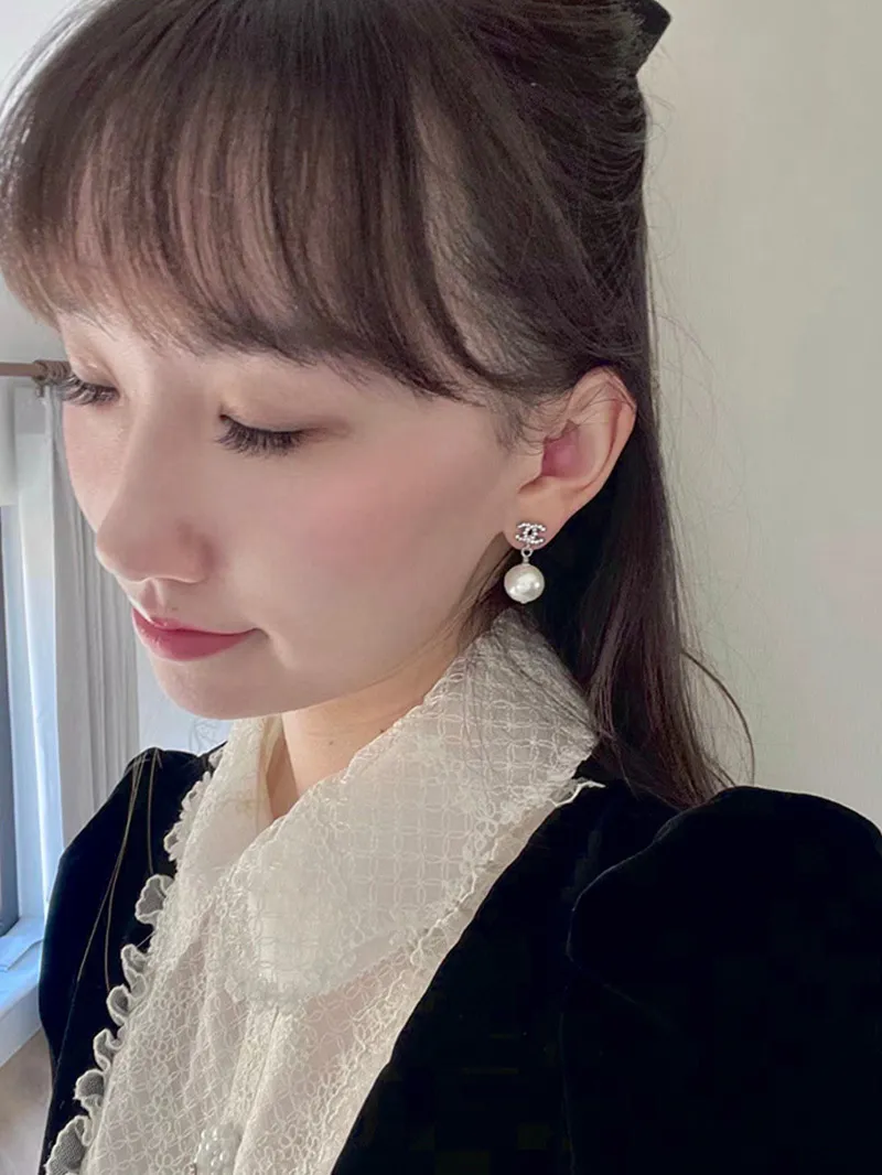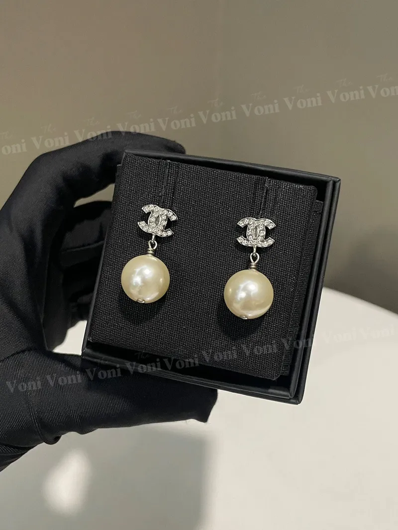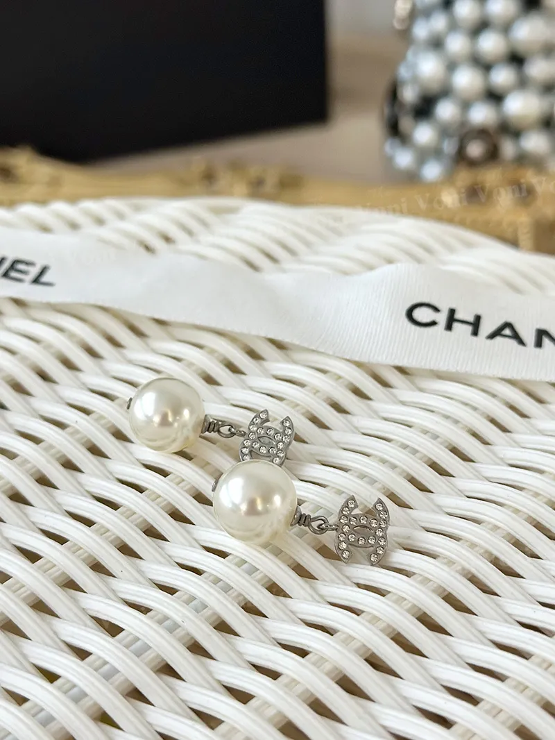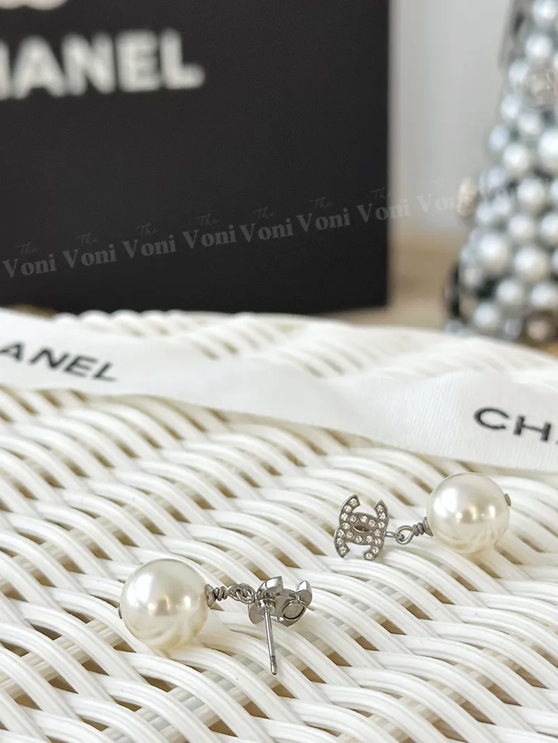 現貨-CHANEL 水鑽鑲嵌珍珠墜飾耳環(黑金緞帶聖誕包裝)